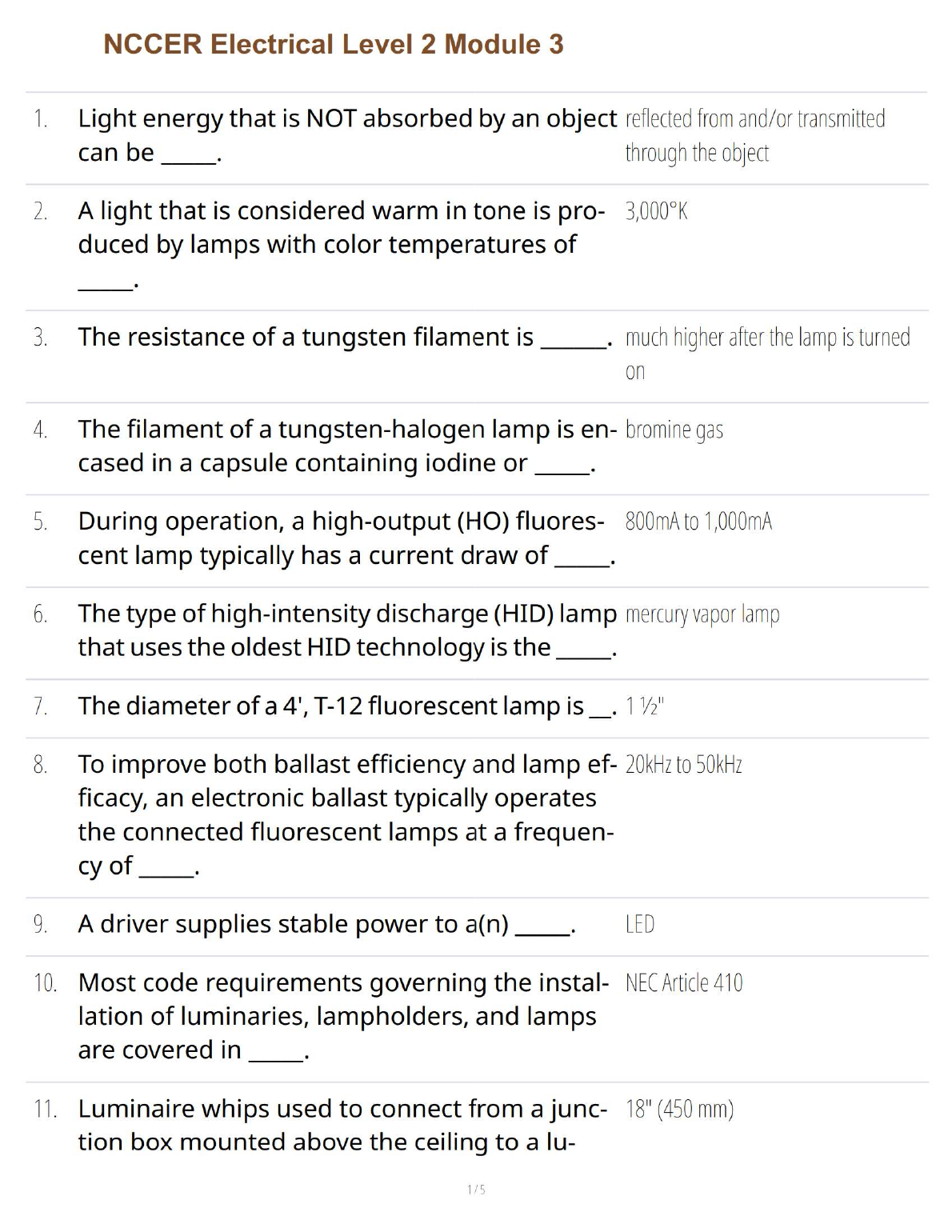 Test Bank for NCCER Electrical Level 2, 11th Edition by NCCER - Module 3: Lighting