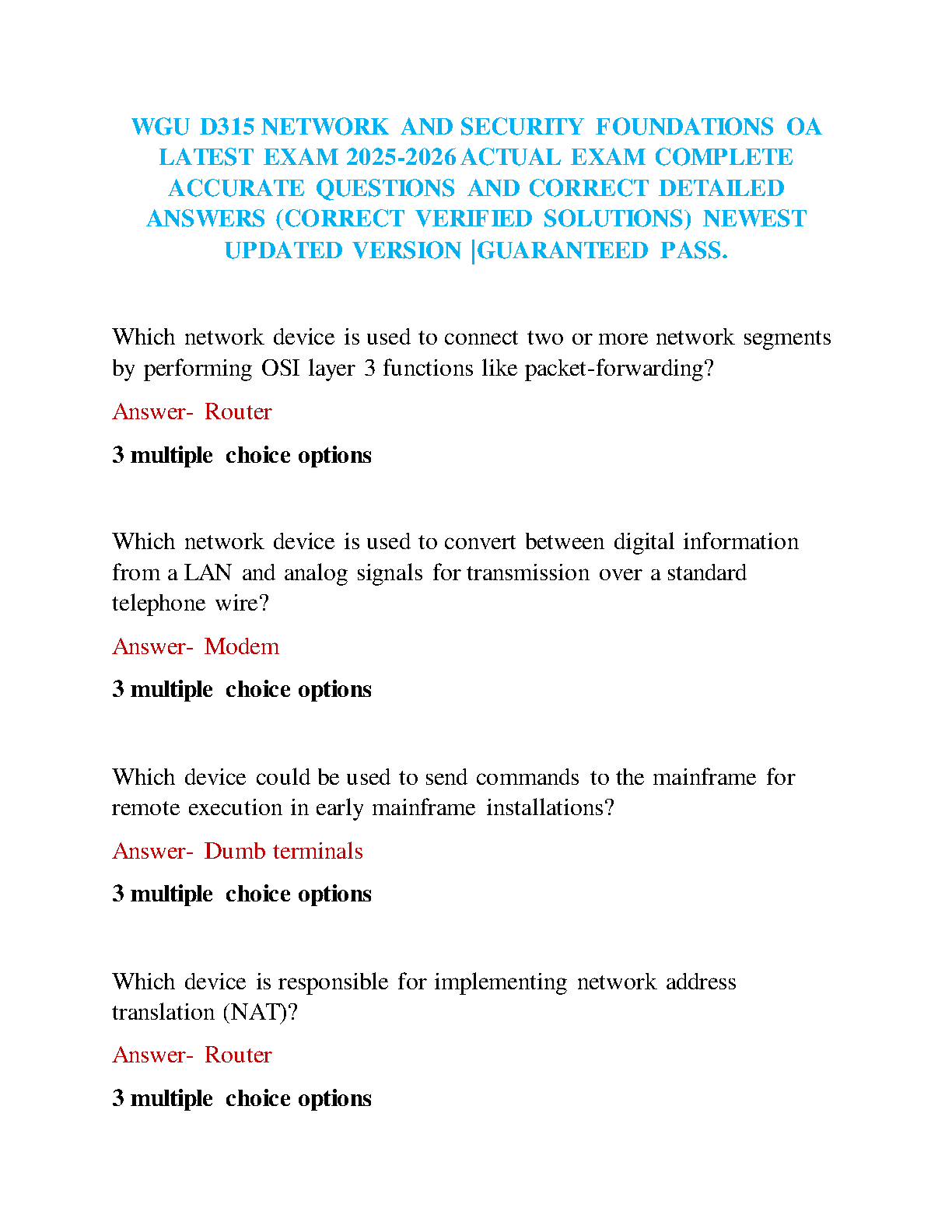 Ace your WGU D315 Network and Security Foundations final exam with confidence! This is the most up-to-date and comprehensive test bank for the 2025-2026 academic year. It features a complete collection of actual Objective Assessment (OA) questions, each paired with detailed, 100% correct and verified answers. Stop worrying about resits! Our expertly compiled resource is designed to help you grasp key concepts, understand the exam format, and master the material efficiently. By studying with these real exam questions, you'll be fully prepared to pass on your very first attempt. Get the grade you deserve and accelerate your degree progress with this essential study guide.