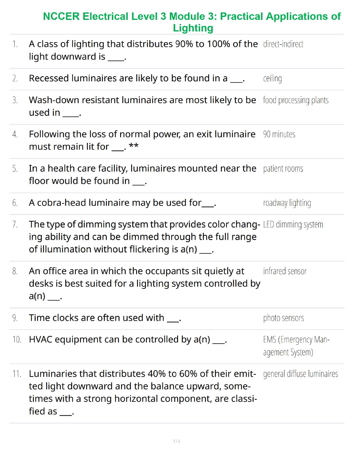 Gain a comprehensive understanding of lighting principles with the official Test Bank for Module 3: Practical Applications of Lighting, from the NCCER Electrical Level 3, 10th Edition curriculum. This invaluable resource features a complete set of questions and expertly verified answers, covering everything from different luminaire types and their uses to advanced lighting control systems and emergency lighting requirements. Topics include direct-indirect lighting, recessed fixtures, LED dimming systems, and the use of sensors in modern electrical installations. Perfect for electrical apprentices and students preparing for their module exams, this test bank is your key to mastering the material, identifying areas for improvement, and confidently passing your assessments. Download now for immediate access to the study materials you need to succeed.