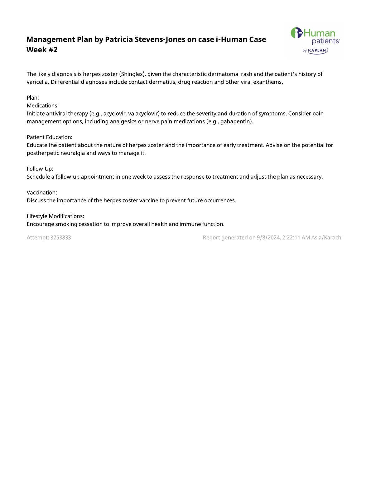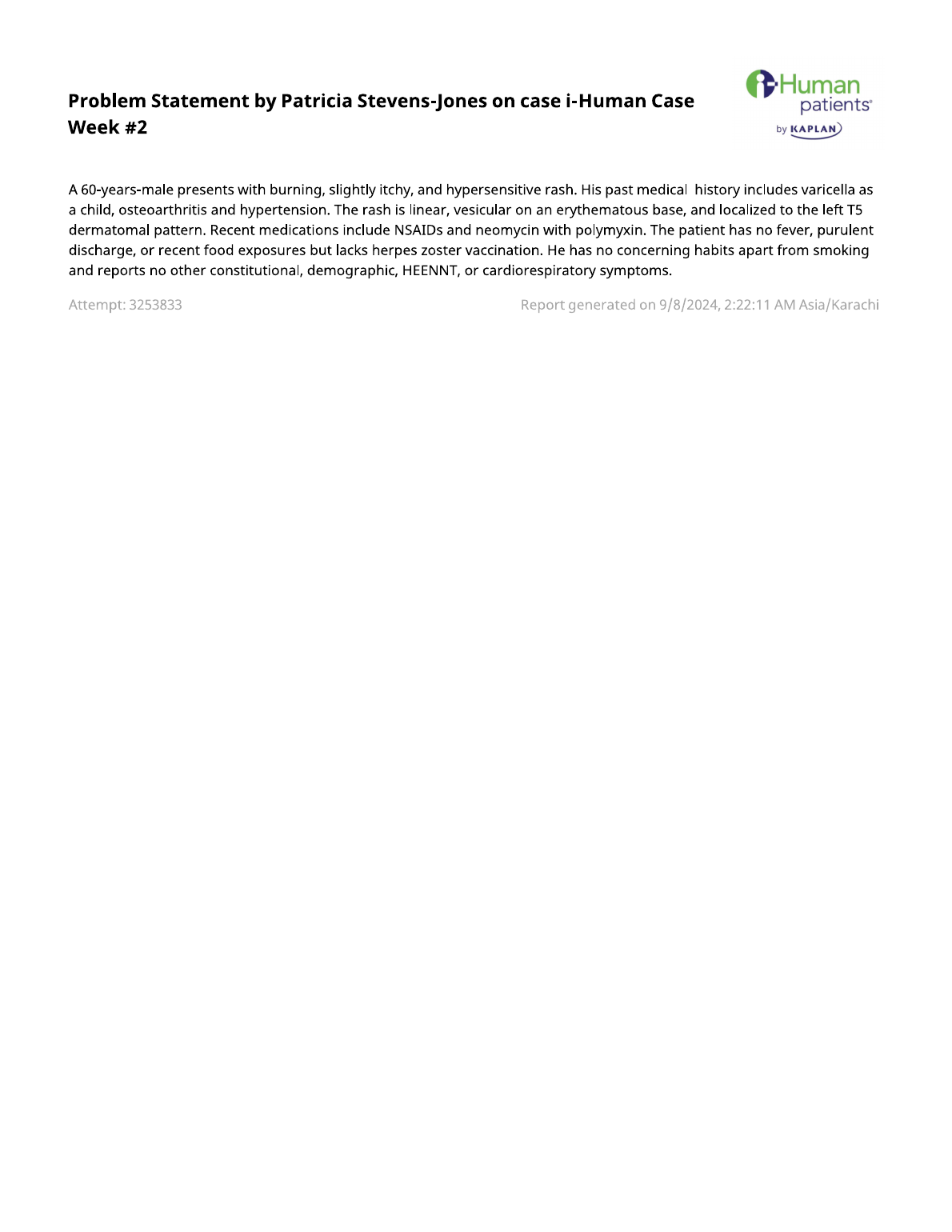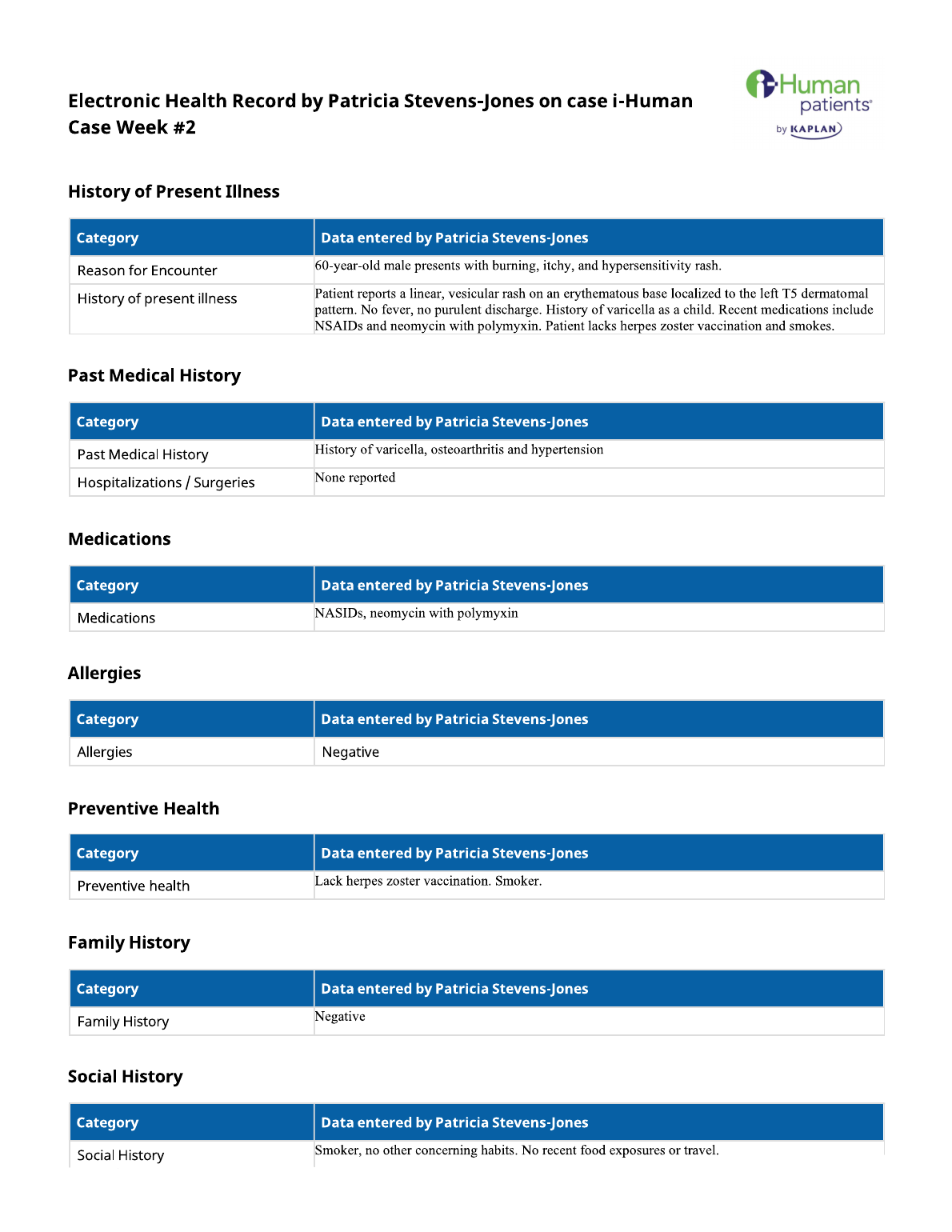 Struggling with the i-Human Patricia Stevens-Jones Week 2 case study? Unlock a guaranteed pass with our comprehensive 2025/2026 study guide. This resource provides detailed, step-by-step answers and expert rationale for every section of the simulation, including patient history, physical examinations, key findings, differential diagnosis, and the final management plan. Stop guessing and start learning how to master the i-Human platform. Our guide is expertly crafted to help you achieve a high score on your first attempt, saving you from the stress and cost of resits. Download now and confidently tackle your nursing or medical coursework.