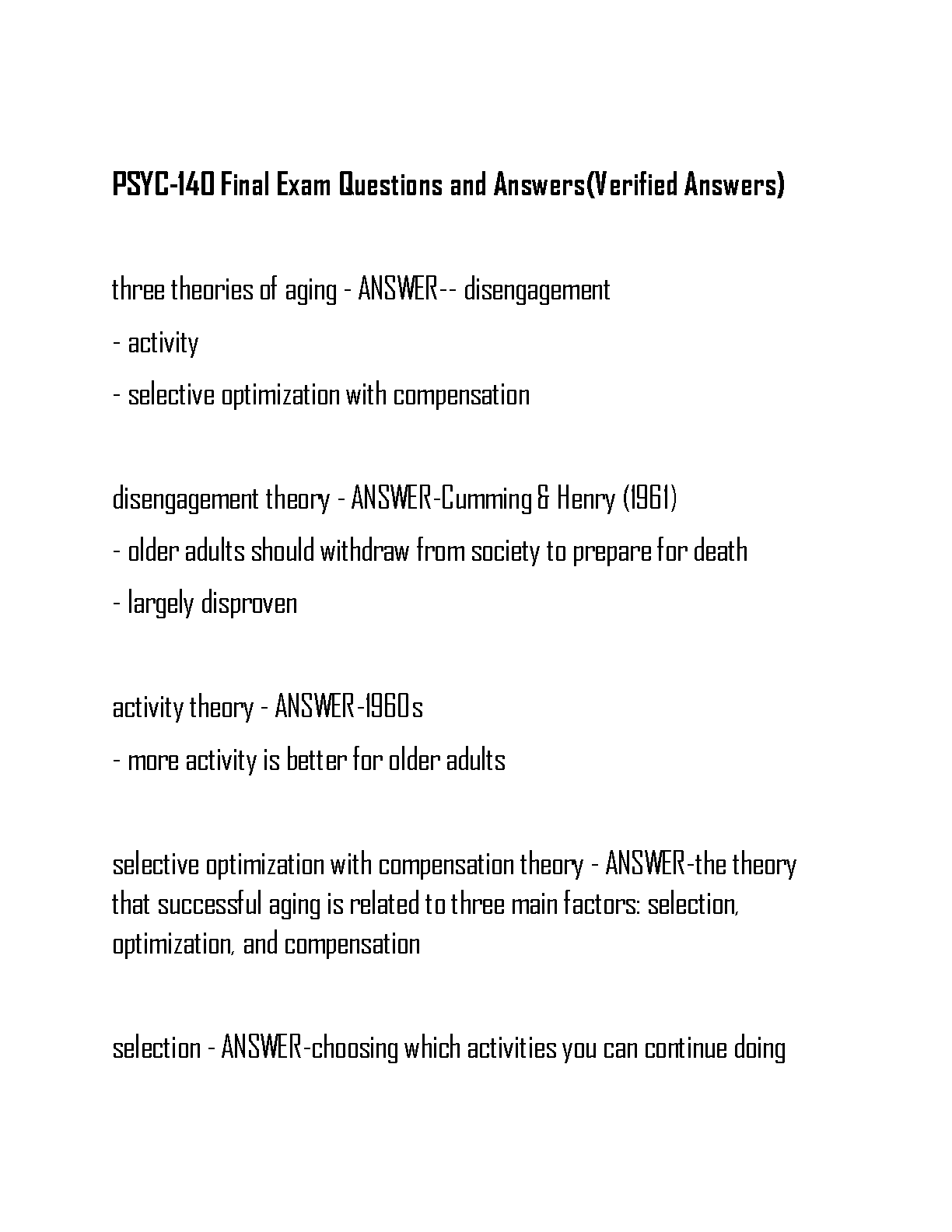 Struggling with your PSYC-140 final exam preparation? Unlock your potential with our latest 2025/2026 study guide! This resource provides a detailed compilation of verified questions and answers, focusing on crucial topics like the theories of aging (disengagement, activity, and selective optimization with compensation). Designed in a clear Q&A format, this exam elaboration simplifies complex concepts, helping you study efficiently and effectively. Ace your exam on the first try and avoid resits by mastering the essential knowledge needed for success. Download now for a guaranteed pass!