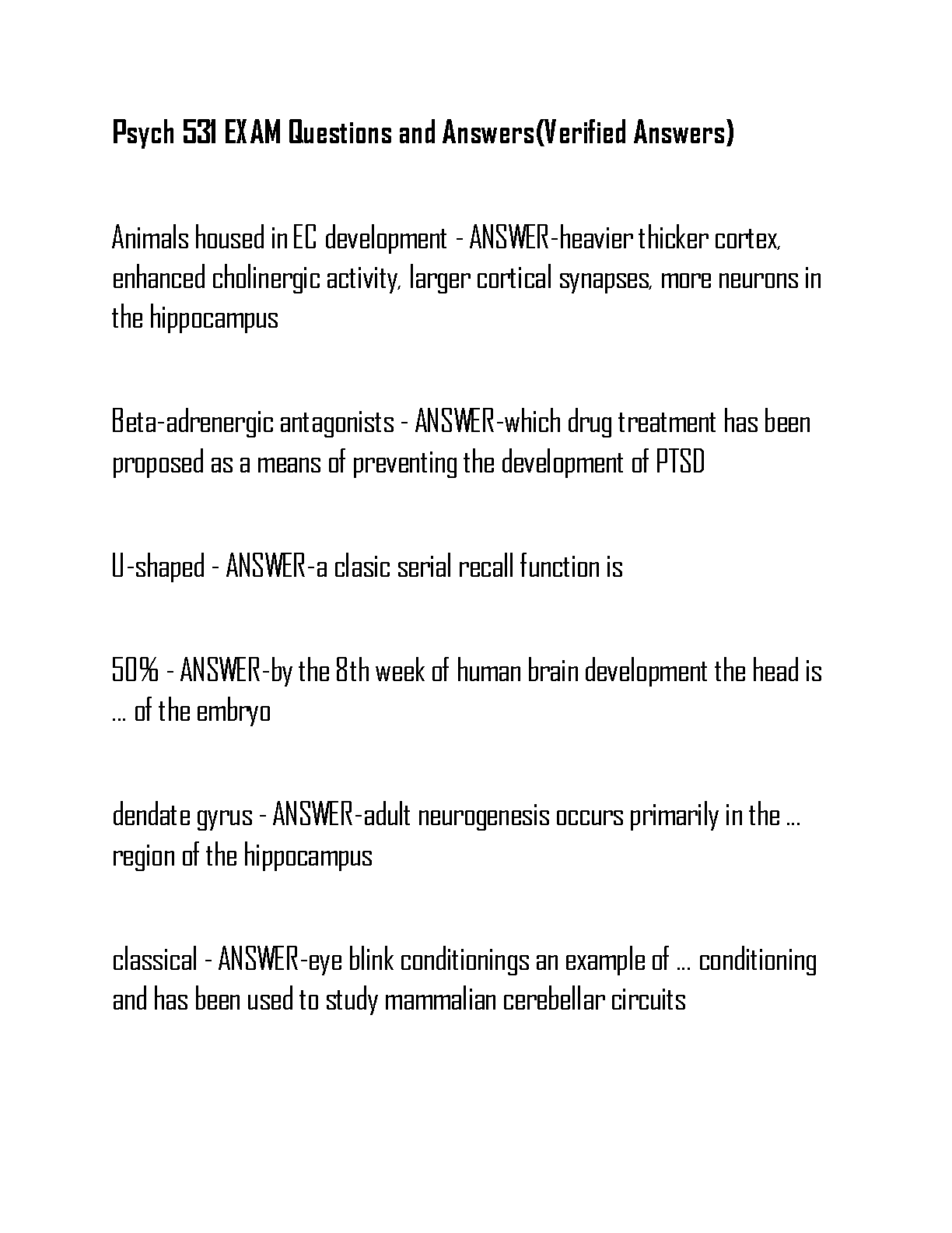 Unlock your full potential in Psych 531 with our comprehensive test bank. This curated collection features a wide range of verified exam questions and detailed answers, covering crucial topics in behavioral neuroscience. Dive deep into concepts like adult neurogenesis in the dentate gyrus, the effects of beta-adrenergic antagonists on PTSD, classical conditioning circuits, and early brain development. This study guide is expertly designed to help you grasp complex material, prepare efficiently for your exams, and achieve academic success in your psychology course.