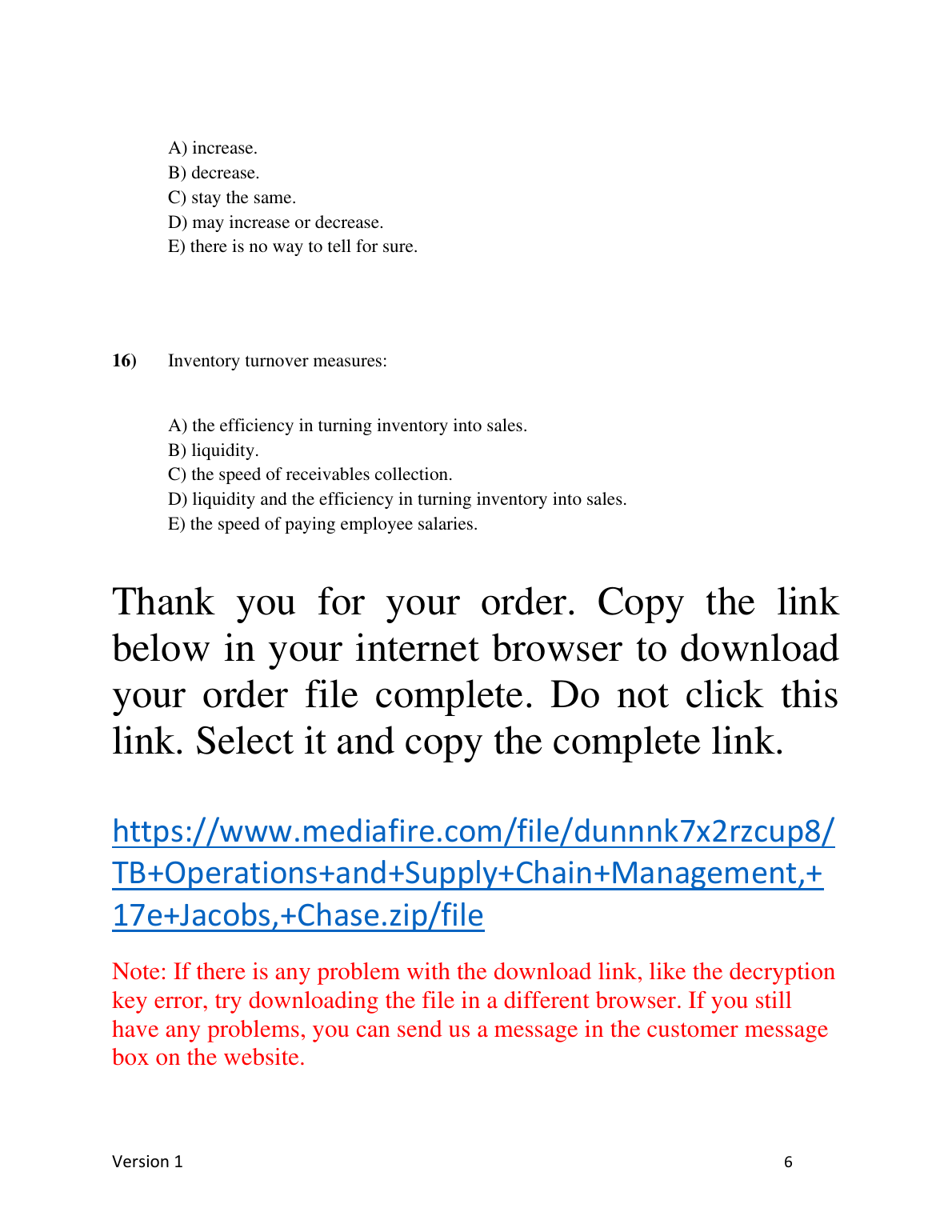 Test Bank for Operations and Supply Chain Management, 17th Edition BY Jacobs, Chase (All Chapters Answer Download link at the end of this file). DOWNLOAD on www.hackedexams.com INSTANTLY.