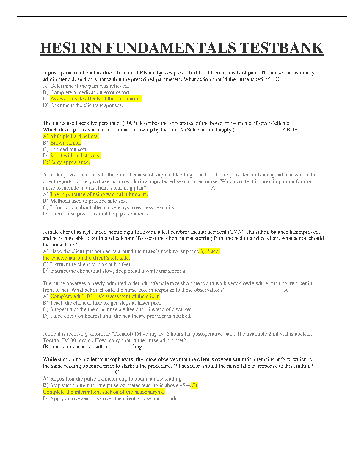 HESI RN Fundamentals Test Bank for Potter & Perry's Fundamentals of Nursing, 11th Edition by Potter, Perry, Stockert, & Hall