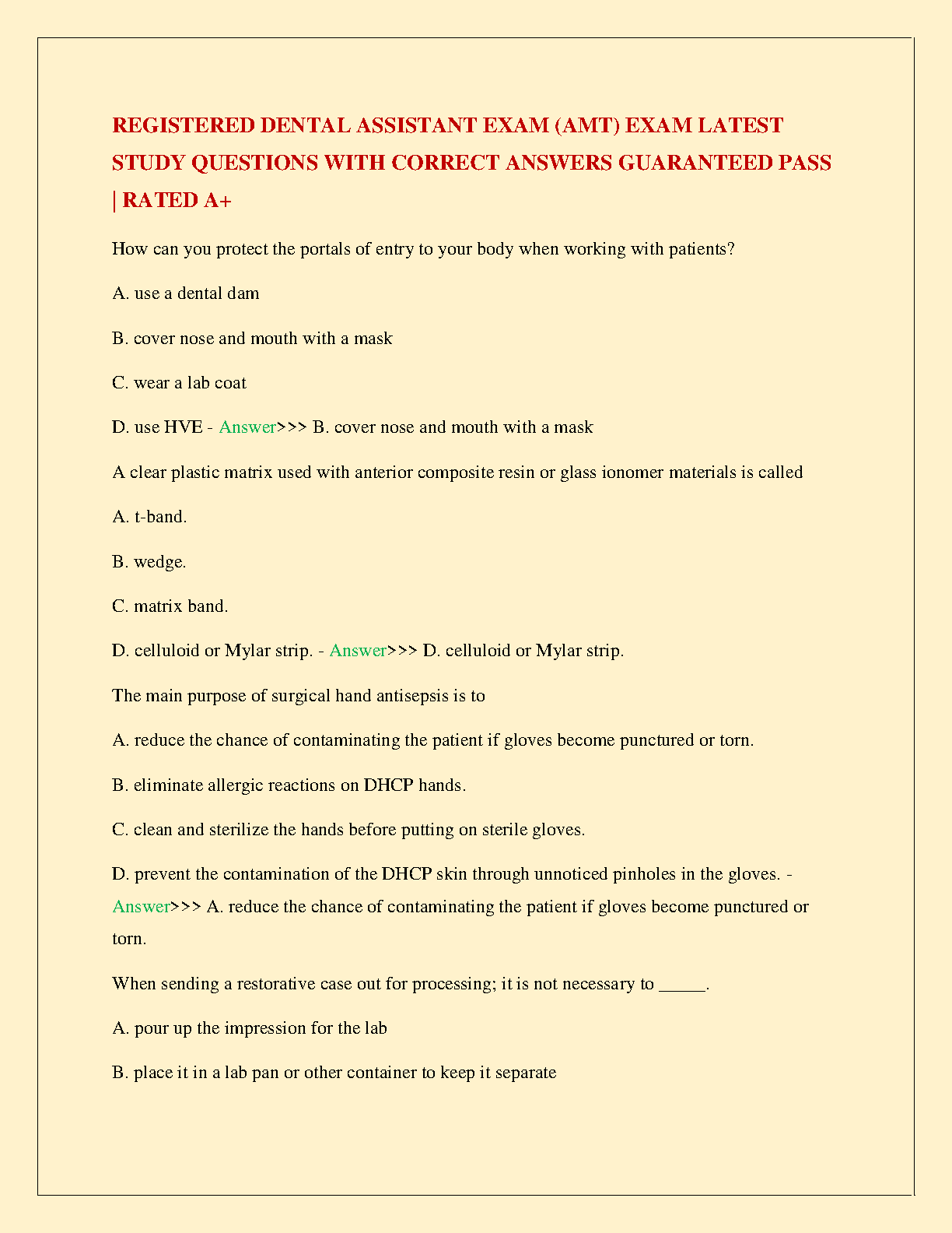 Pass your AMT Registered Dental Assistant (RDA) certification exam on the first attempt with our top-rated 2024-2025 test bank. This complete study guide features a vast collection of the latest exam-style questions, each with a correct, verified answer. Covering crucial topics like infection control, dental materials, and patient care procedures, this resource is meticulously designed to ensure you achieve an A+ score. Prepare effectively, build your confidence, and secure your RDA certification with this essential study tool.