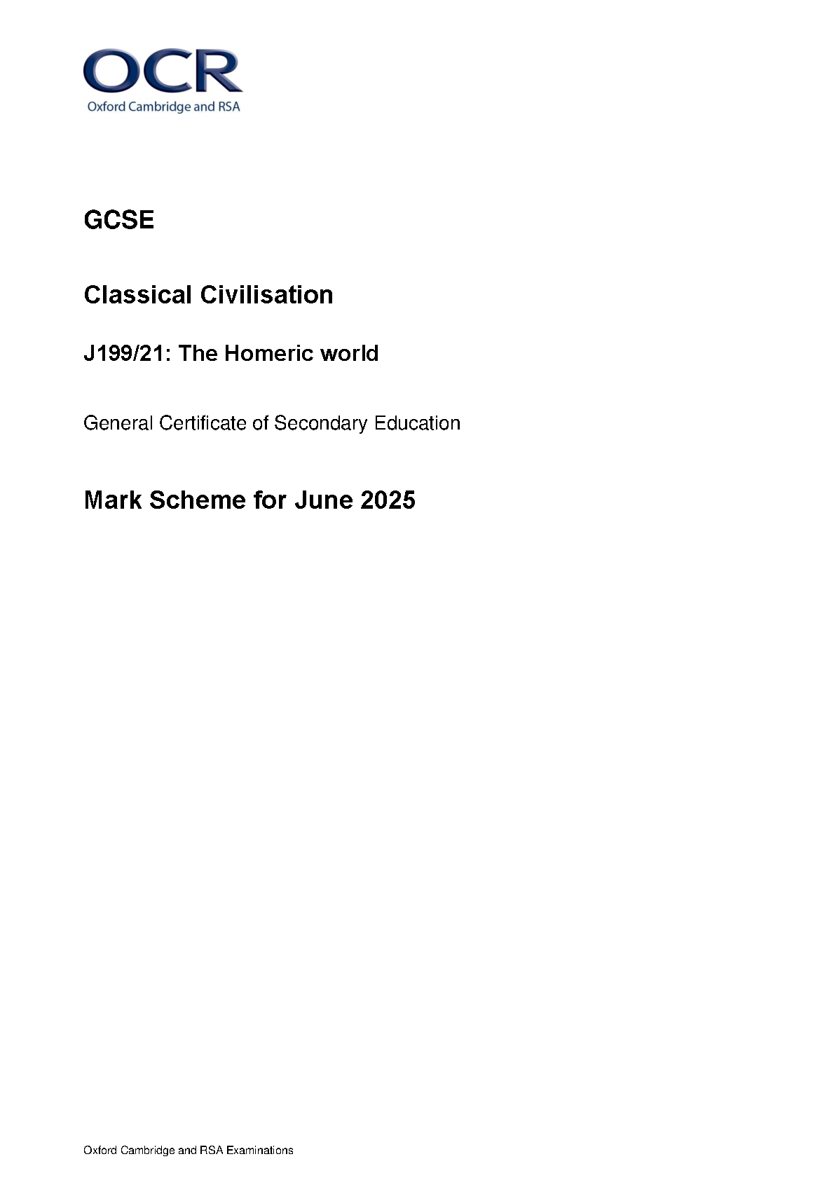 2025 OCR GCSE Classical Civilisation Mark Scheme Paper 21 (J199/21: The Homeric world)