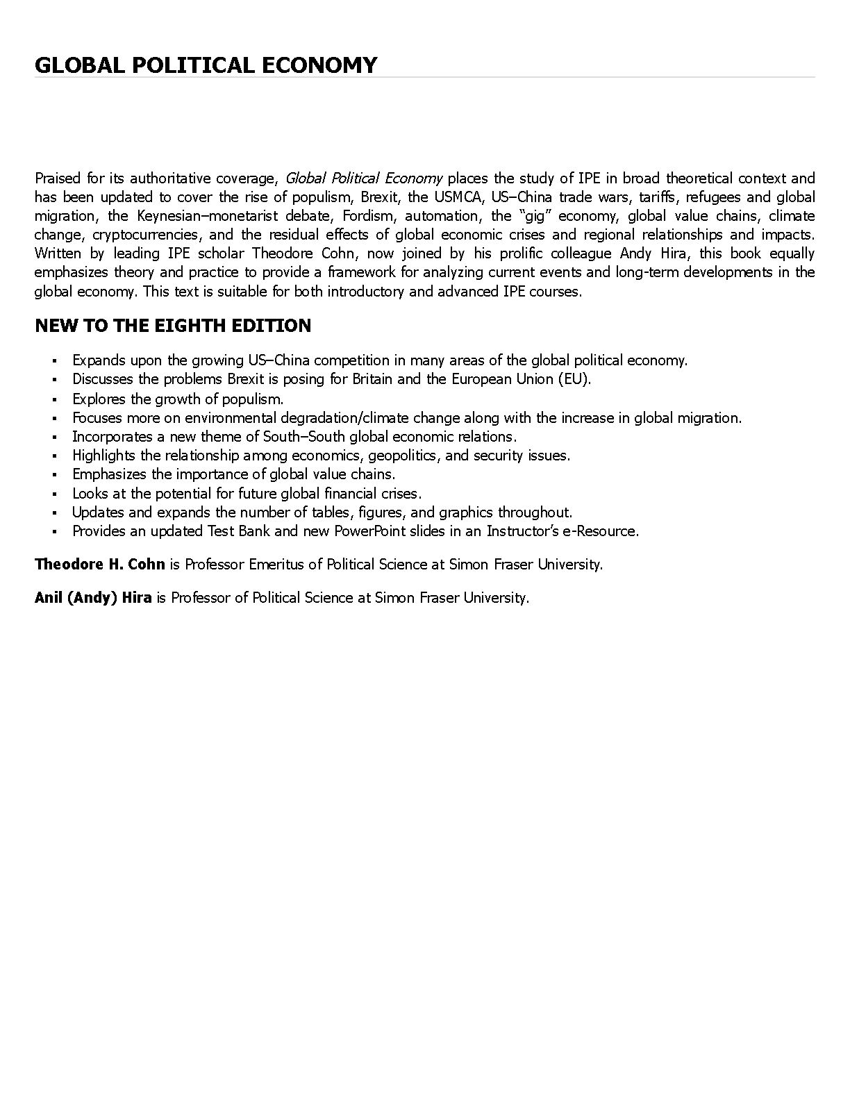 Test Bank for Global Political Economy: Theory and Practice, 8th Edition by Theodore H. Cohn and Anil Hira