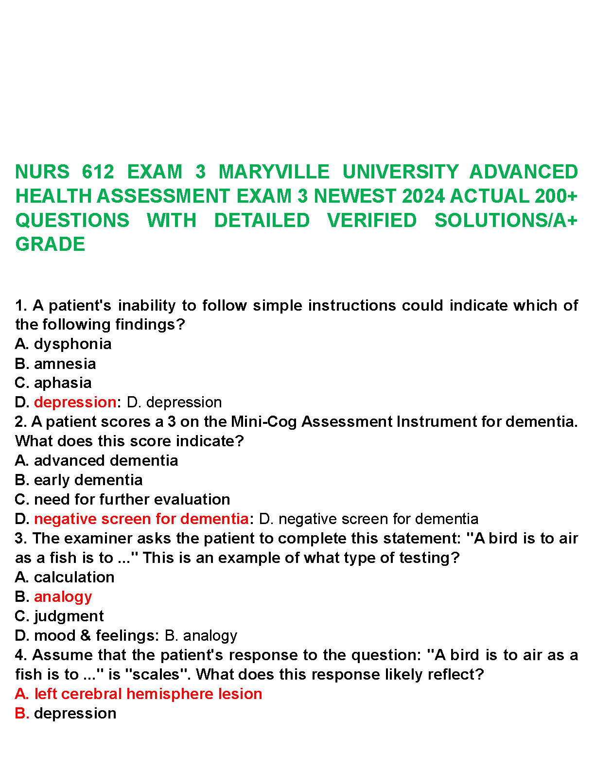 Ace your Advanced Health Assessment exam with this comprehensive test bank for NURS 612 Exam 3 at Maryville University. This is the latest 2024 version, packed with over 200 actual exam-style questions and detailed, verified solutions. Each answer is explained to ensure you thoroughly understand the concepts, not just memorize the information. Designed to help you achieve an A+ grade, this study guide covers all the critical topics you'll face on the test. Download now and confidently prepare to pass your exam with flying colors!
