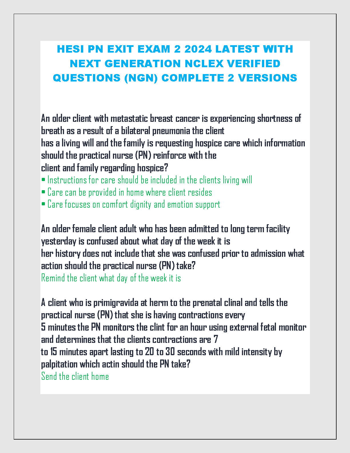 HESI PN Exit Exam 2 2024: NGN Test Bank with Verified Questions and Answers (Complete 2 Versions)