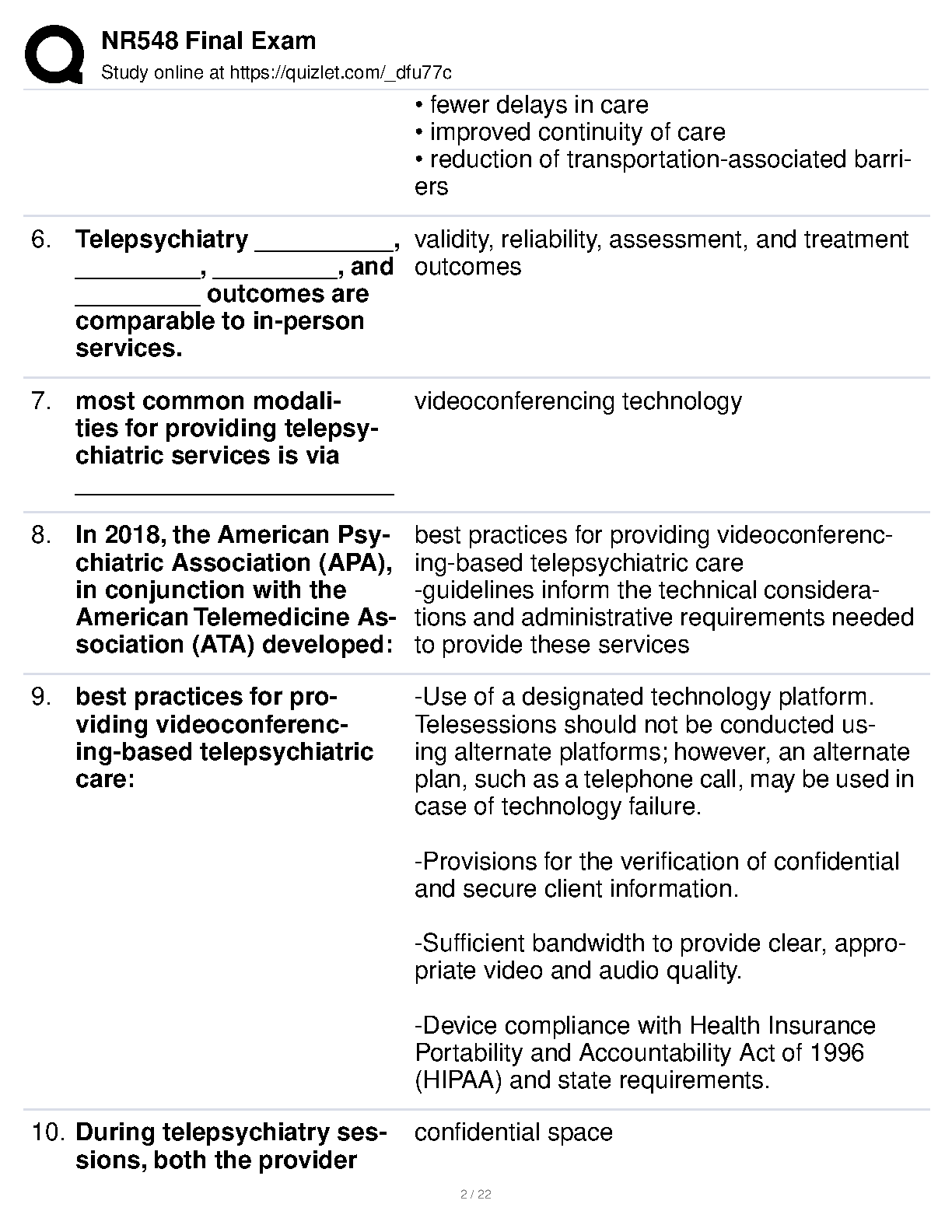 Master the key concepts for your NR548 Final Exam with our latest 2025/2026 study guide. This comprehensive resource provides detailed notes and elaborations, focusing on crucial topics like Telepsychiatry, its definition, APA guidelines, diverse service settings, delivery methods, and significant benefits. Designed to streamline your study process, this guide is your ultimate tool to confidently pass the NR548 exam on your first attempt and avoid costly resits. Get the essential knowledge you need to succeed in your nursing program.
