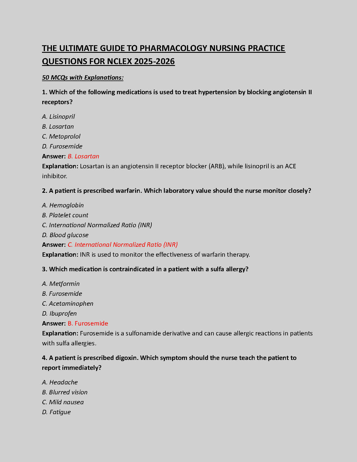 Are you preparing for the NCLEX and find pharmacology challenging? Our comprehensive 2025-2026 study guide is here to help you succeed! This resource provides 50 meticulously crafted multiple-choice questions covering essential pharmacology topics you'll encounter on the real exam. Each question comes with a clear, in-depth explanation (rationale) to help you understand the 'why' behind the correct answer, solidifying your knowledge of drug actions, side effects, and nursing considerations. This guide is your ultimate tool to build confidence, master pharmacology concepts, and pass the NCLEX on your very first attempt, avoiding costly and stressful resits.