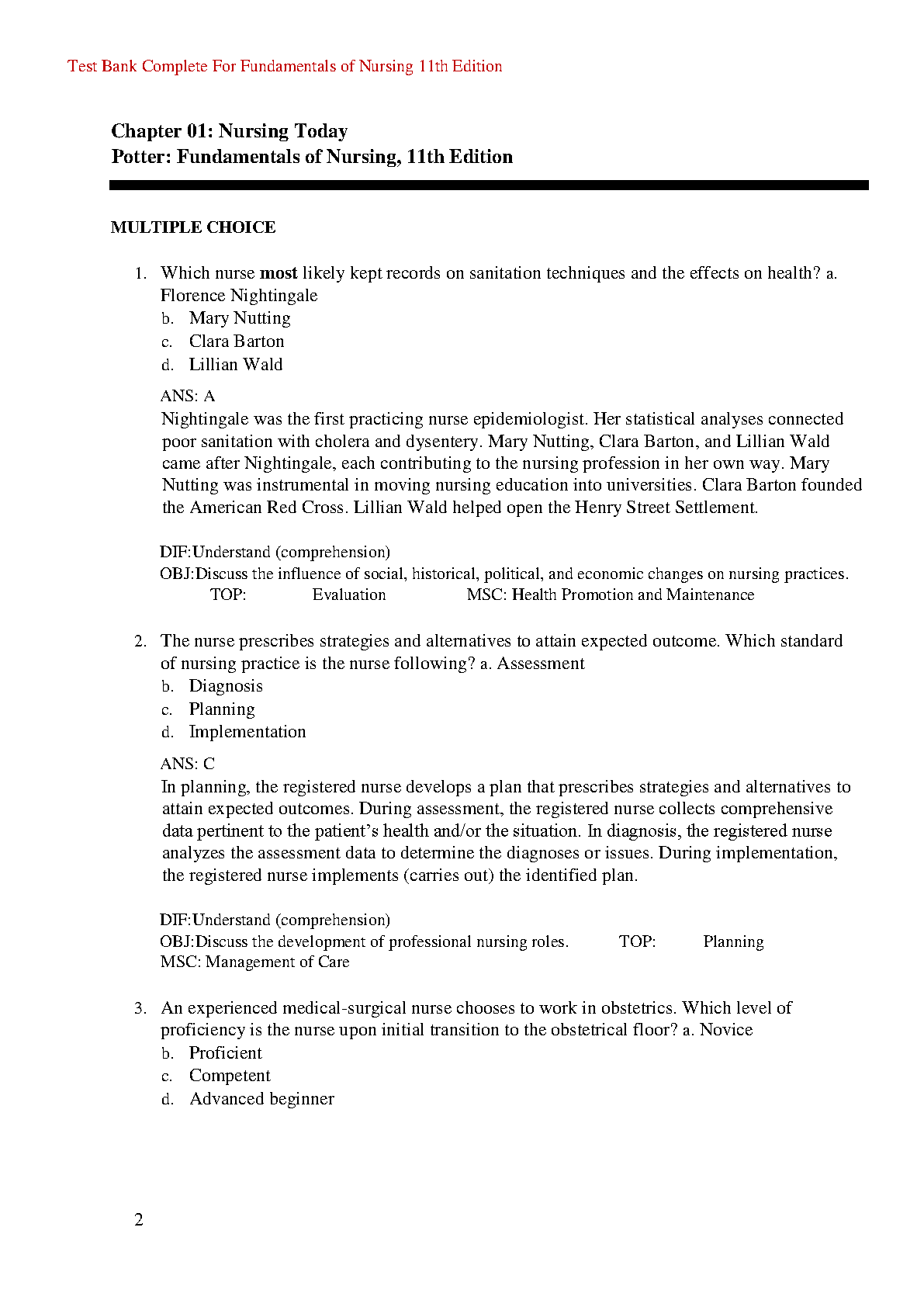 Unlock your full potential and excel in your nursing studies with the complete Test Bank for 'Fundamentals of Nursing, 11th Edition' by Potter, Perry, Stockert, and Hall. This indispensable resource provides an extensive collection of practice questions and answers covering every chapter of the textbook. Designed to sharpen your critical thinking and test-taking skills, this test bank helps you master key concepts, prepare effectively for exams, and build a solid foundation for your nursing career. Get instant access to all materials and start your journey to academic success today.
