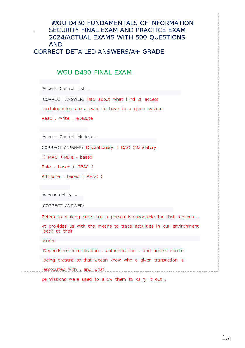 Ace your WGU D430: Fundamentals of Information Security final exam with our comprehensive test bank. This extensive resource features over 500 practice questions and answers sourced directly from the 2024 actual exams. Each question is paired with a correct, detailed answer, verified to help you achieve an A+ grade. Master key concepts such as Access Control Models, Accountability, and more. This is the ultimate study guide to help you pass your exam confidently on the first try. Download now for instant access.