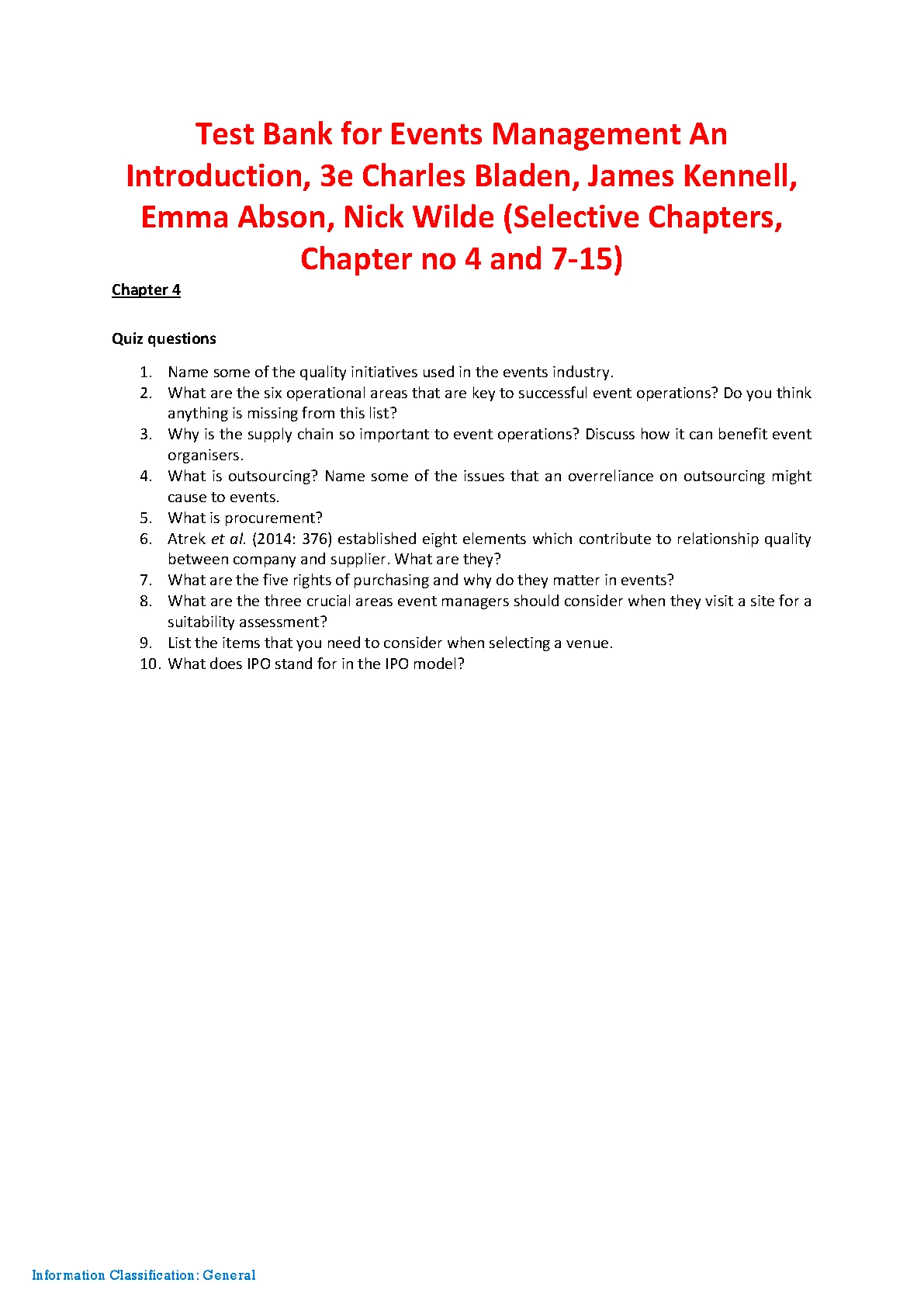 Test Bank for Events Management An Introduction, 3rd Edition BY Charles Bladen, James Kennell, Emma Abson, Nick Wilde (Selective Chapters, Chapter no 4 and 7-15)