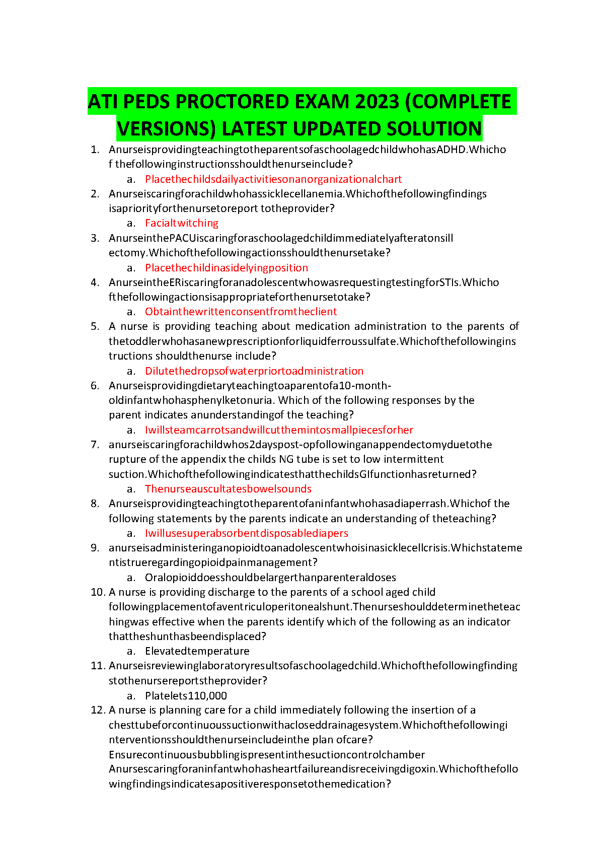 ATI PEDS Proctored Exam 2023 Test Bank | Comprehensive Questions and Verified Answers for Nursing Students