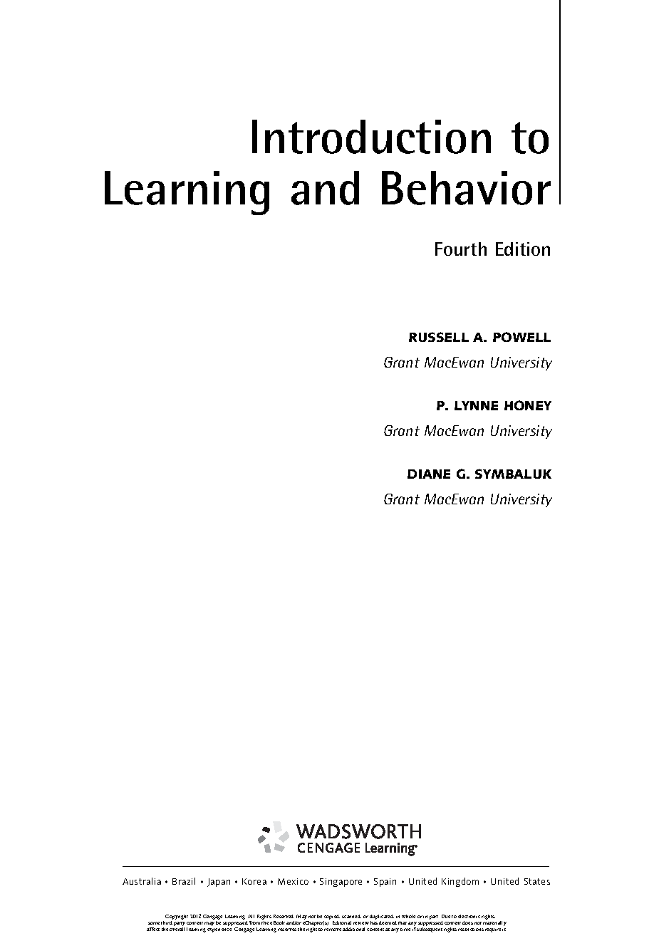 Test Bank for Introduction to Learning and Behavior, 4th Edition by Russell A. Powell, P. Lynne Honey, Diane G. Symbaluk