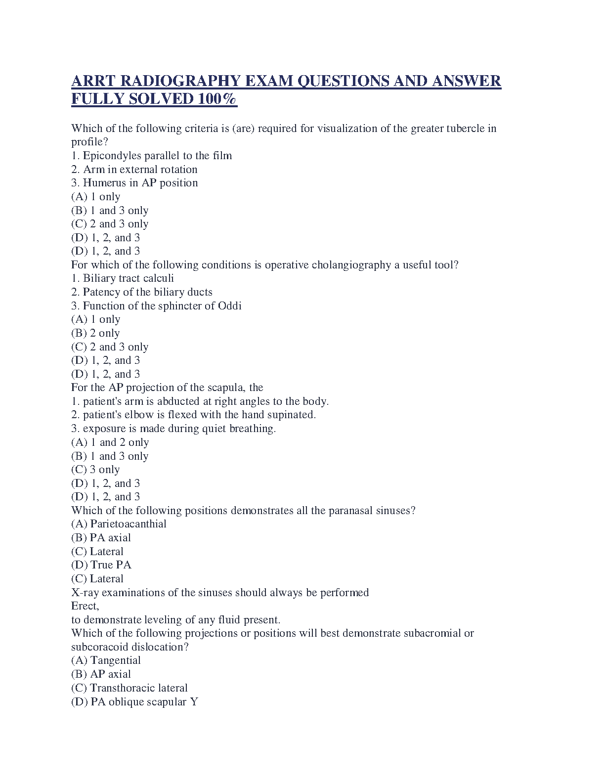 Ace your ARRT Radiography certification with our latest 2025/2026 Test Bank! This comprehensive resource is expertly designed to help you pass on your very first try. Inside, you'll find a vast collection of exam-style questions, each with a fully solved and verified answer. This guide covers all critical topics you'll face on the exam, including patient positioning, radiographic procedures, imaging criteria for specific anatomical structures like the greater tubercle and paranasal sinuses, and specialized techniques such as operative cholangiography. Stop worrying about resits and start preparing with confidence. Our 100% solved question bank is the ultimate tool to master the material and secure your ARRT certification.