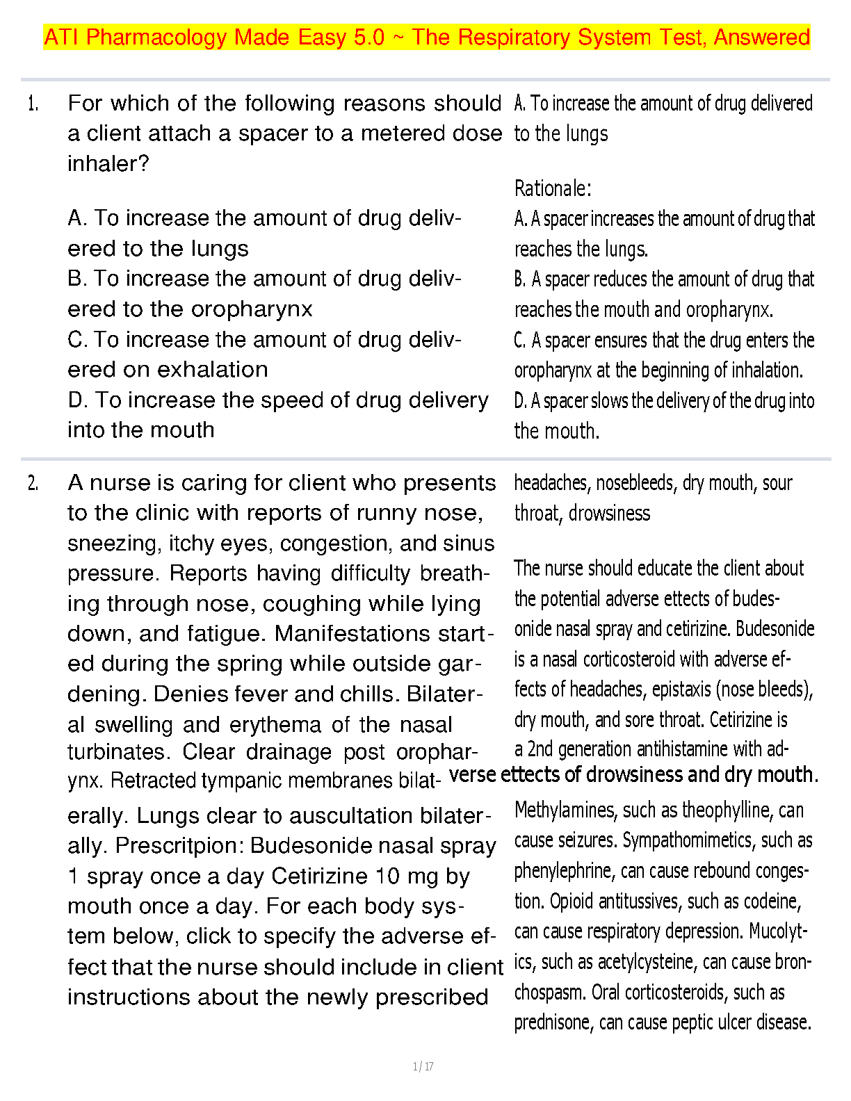 Master the complexities of respiratory pharmacology with this comprehensive test bank for ATI's Pharmacology Made Easy, 5th Edition. This essential study guide is tailored to 'The Respiratory System' chapter, providing a full suite of practice questions, complete with correct answers and detailed rationales. Deepen your understanding of medication delivery, such as the use of spacers with inhalers, and learn to identify potential adverse effects of common drugs like budesonide and cetirizine. This resource is expertly designed to help nursing students effectively prepare for exams, reinforce classroom learning, and build the confidence needed to excel in their pharmacology coursework.