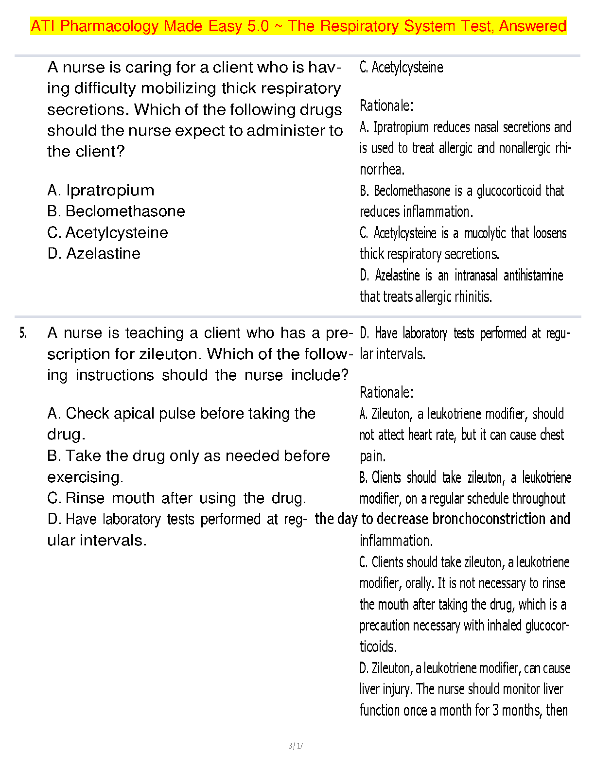 Test Bank for Pharmacology Made Easy 5.0 by Assessment Technologies Institute | The Respiratory System Chapter | Questions, Answers & Rationales