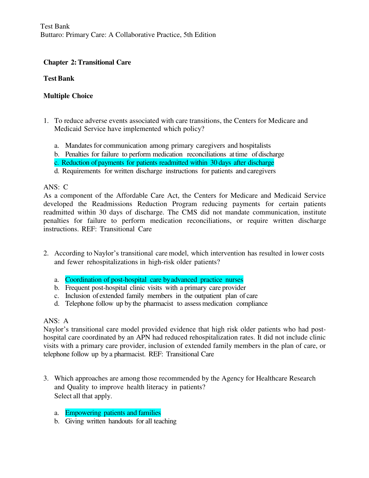 TEST BANK PRIMARY CARE- A COLLABORATIVE PRACTICE, 5TH EDITION BY TERRY MAHAN BUTTARO ALL CHAPTERS 1-250 COVERED UPDATED 2023