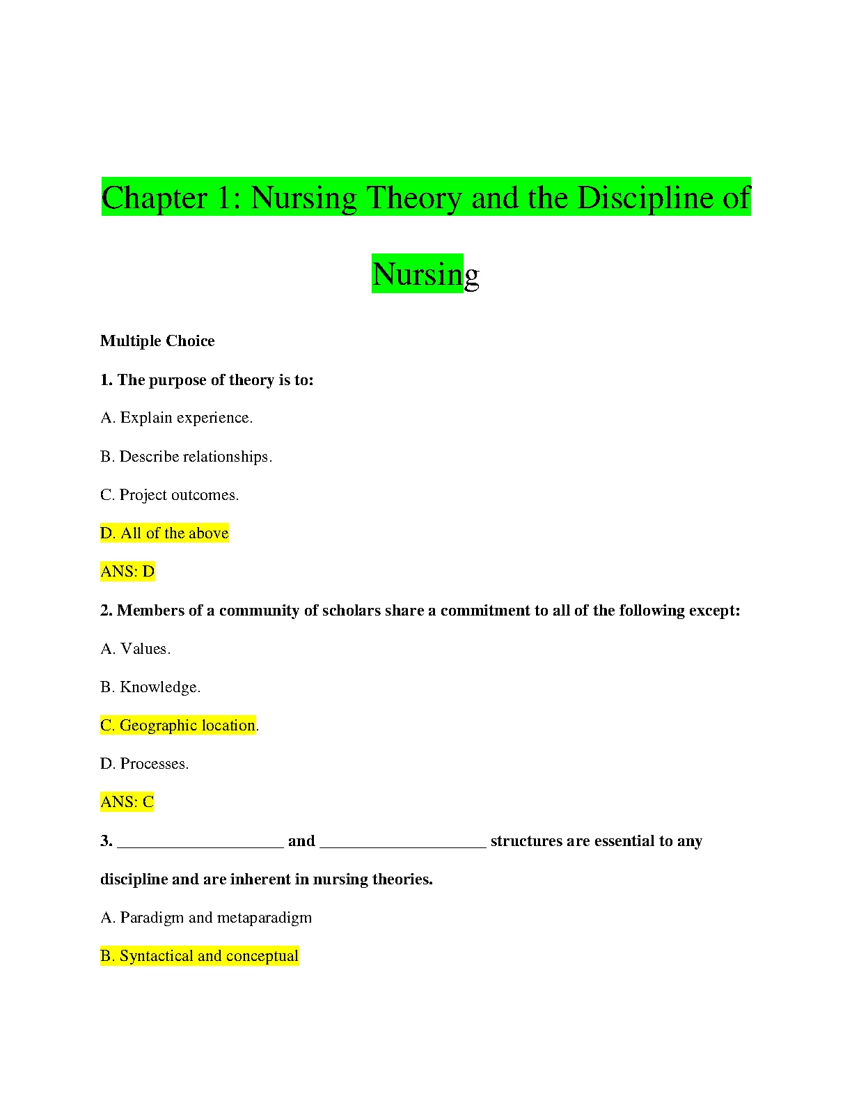 TEST BANK FOR NURSING (Chapter 1: Nursing Theory and the Discipline of Nursing)
