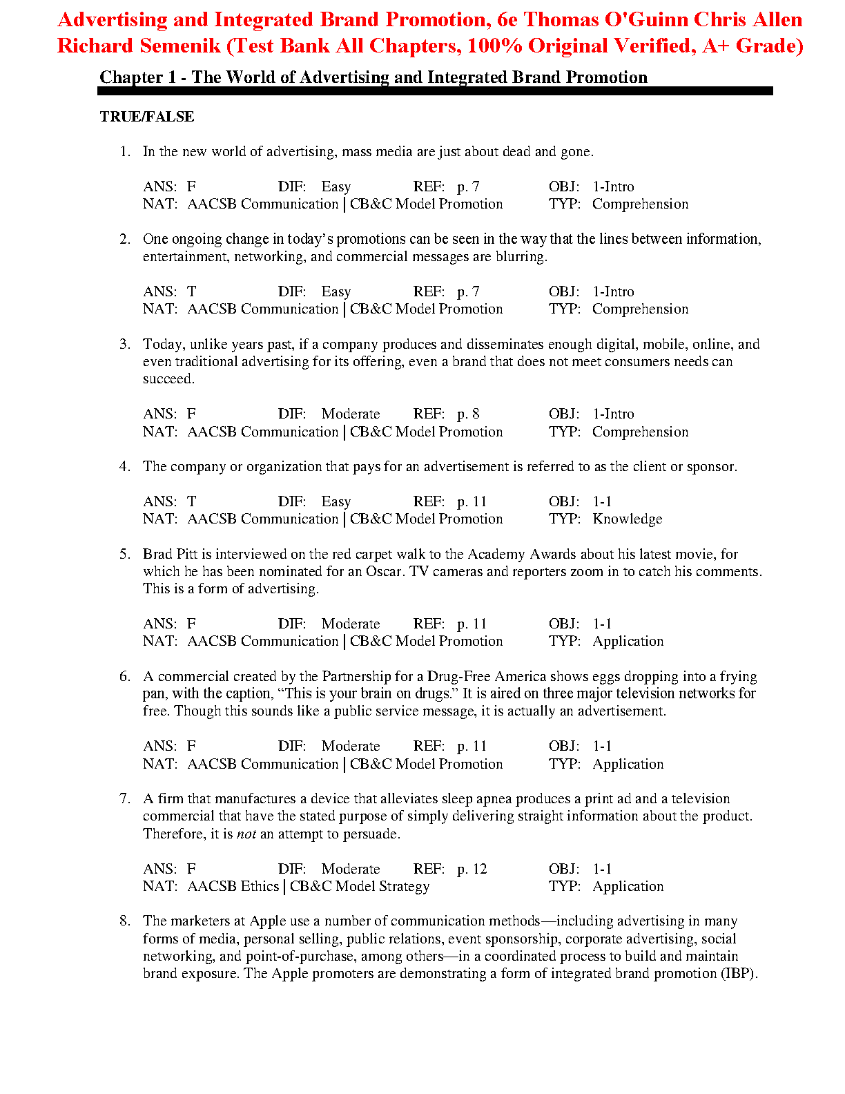 Test Bank for Advertising and Integrated Brand Promotion, 6th Edition by Thomas C. O'Guinn, Chris T. Allen, Richard J. Semenik