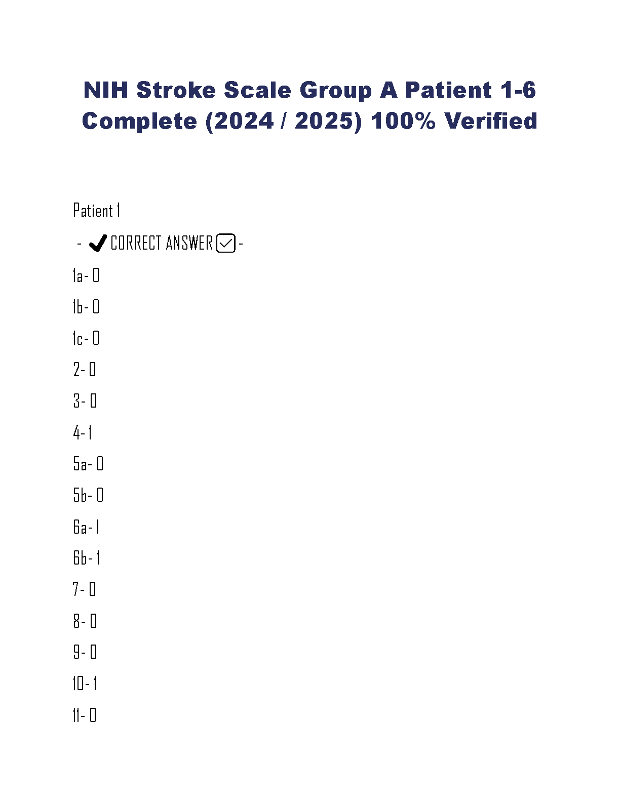 Get immediate access to the complete and verified answers for the NIH Stroke Scale (NIHSS) Certification Test, Group A, Patients 1-6. This comprehensive test bank is updated for the 2024-2025 assessment period and guarantees 100% accuracy. Ideal for nurses, physicians, and emergency medical personnel preparing for their certification or recertification. Master the scoring for each patient scenario and pass your NIHSS exam with confidence on your first try.