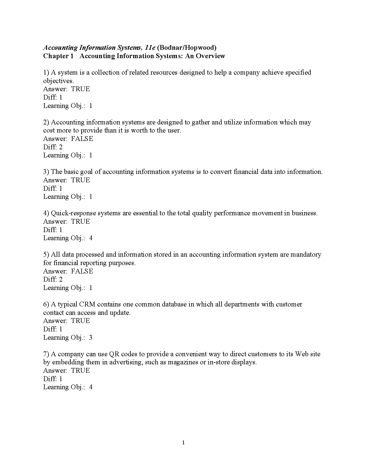 Test Bank for Accounting Information Systems, 11th Edition by George H. Bodnar and William S. Hopwood