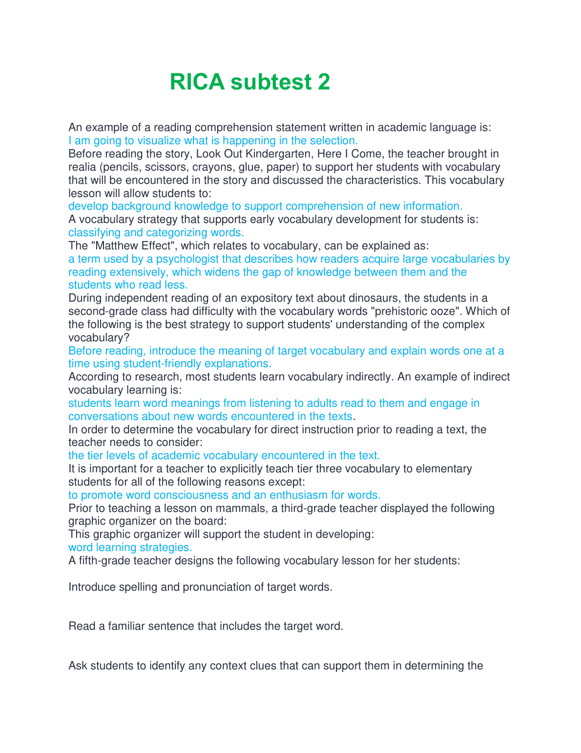 Unlock success on the RICA Subtest 2 with this ultimate 2025/2026 study guide. This exam elaboration provides in-depth explanations and correct answers to critical questions covering vocabulary development, reading comprehension strategies, and effective teaching methods. Dive deep into concepts like the Matthew Effect, tier-three vocabulary instruction, and word learning strategies. This essential resource is expertly designed to build your competence and confidence, helping you ace the RICA exam on your first try.