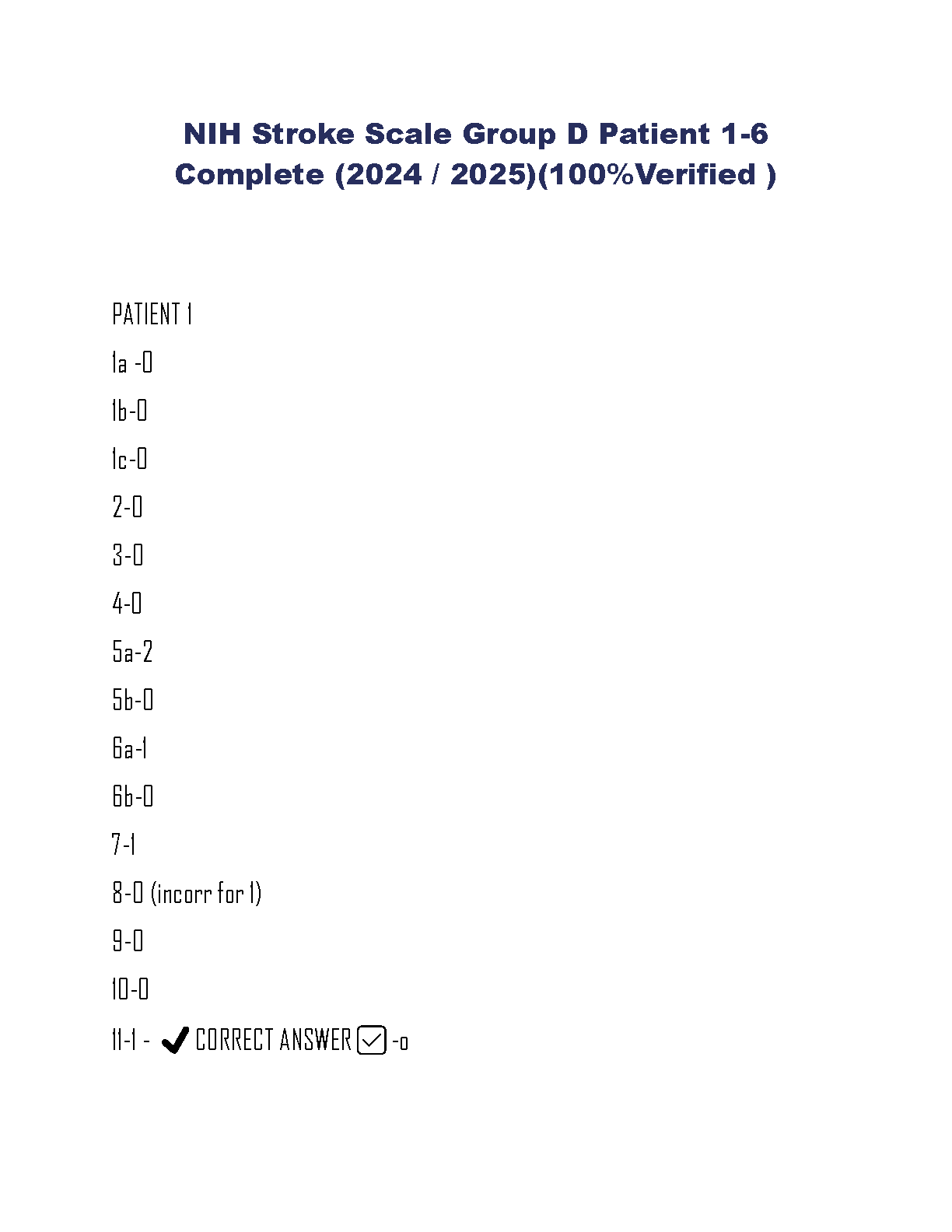 Master the NIH Stroke Scale (NIHSS) certification with our comprehensive and verified answer key for the Group D, Patient 1-6 module. This essential study guide, updated for the 2025-2026 assessment period, provides detailed and accurate answers to help you ace your exam on the first try. Say goodbye to exam anxiety and resits. Download now to secure your certification and boost your clinical credentials with confidence.