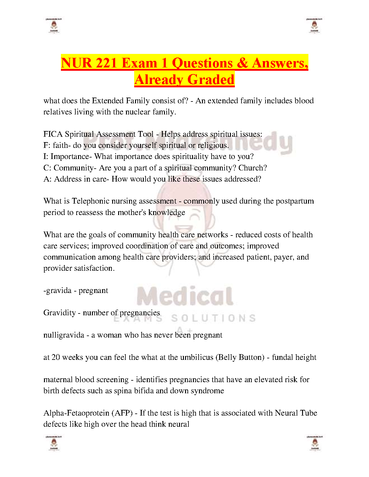 Achieve top grades in your NUR 221 course with this essential Exam 1 Test Bank, fully updated for the 2025/2026 curriculum. This resource provides a complete compilation of 'Already Graded' questions and answers, giving you a reliable and accurate study tool. Dive deep into key topics such as family health, spiritual assessments (FICA), postpartum care, community nursing, pregnancy terminology, and vital prenatal screenings. Designed to ensure you grasp the material and excel on your first attempt, this study guide is your ultimate key to avoiding resits and passing with confidence.