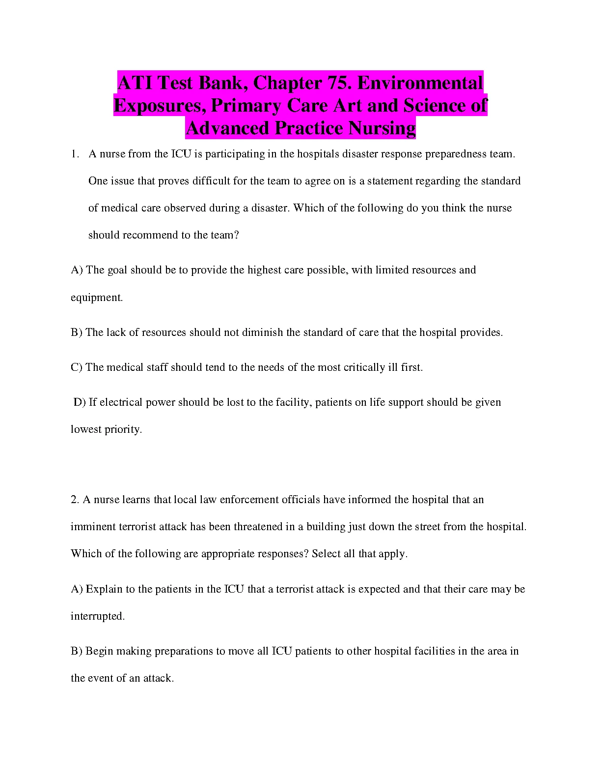 TEST BANNK FOR ATI, Chapter 75. Environmental Exposures, Primary Care Art and Science of Advanced Practice Nursing