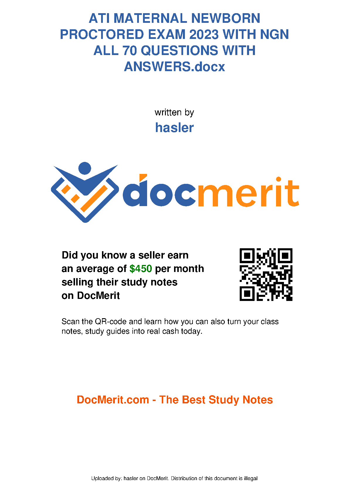 Ace your nursing exams with our definitive study guide for the ATI Maternal Newborn Proctored Exam. This resource, fully updated for the 2025/2026 academic year, provides a complete set of 70 questions paired with expertly verified answers. Designed to mirror the actual test, it incorporates the latest Next Generation (NGN) question formats to ensure you're fully prepared. Stop worrying about resits and gain the confidence to excel. This guide is your key to mastering maternal and newborn nursing concepts and passing the ATI proctored exam on your very first attempt.