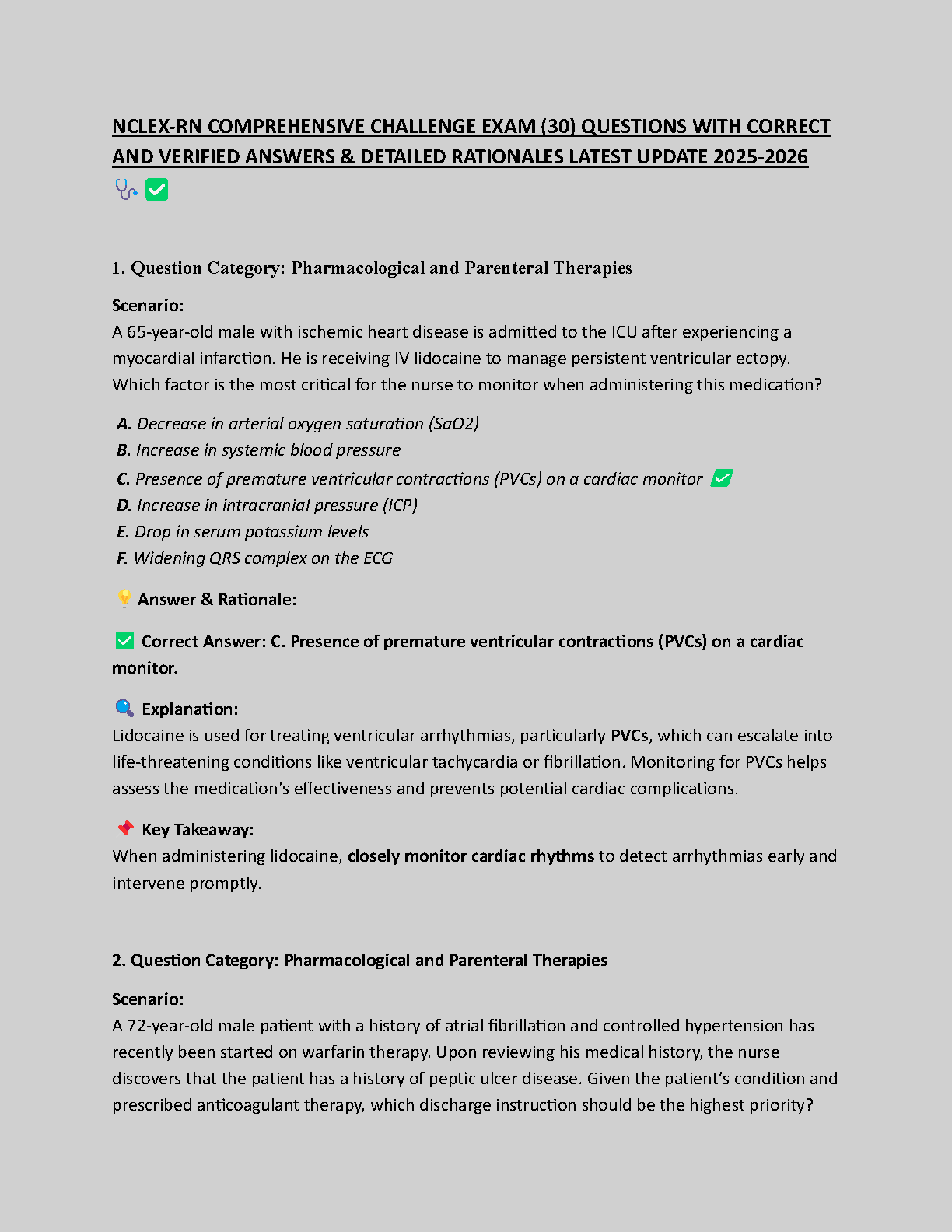 Ace your NCLEX-RN exam with our latest 2025-2026 Comprehensive Challenge Exam Test Bank. This essential study guide features 30 expertly crafted questions, each with a verified correct answer and a detailed rationale to deepen your understanding. Covering key areas like Pharmacological and Parenteral Therapies, this resource is designed to sharpen your clinical judgment and critical thinking skills. Prepare effectively, boost your confidence, and pass the NCLEX-RN on your very first attempt with this indispensable practice tool.