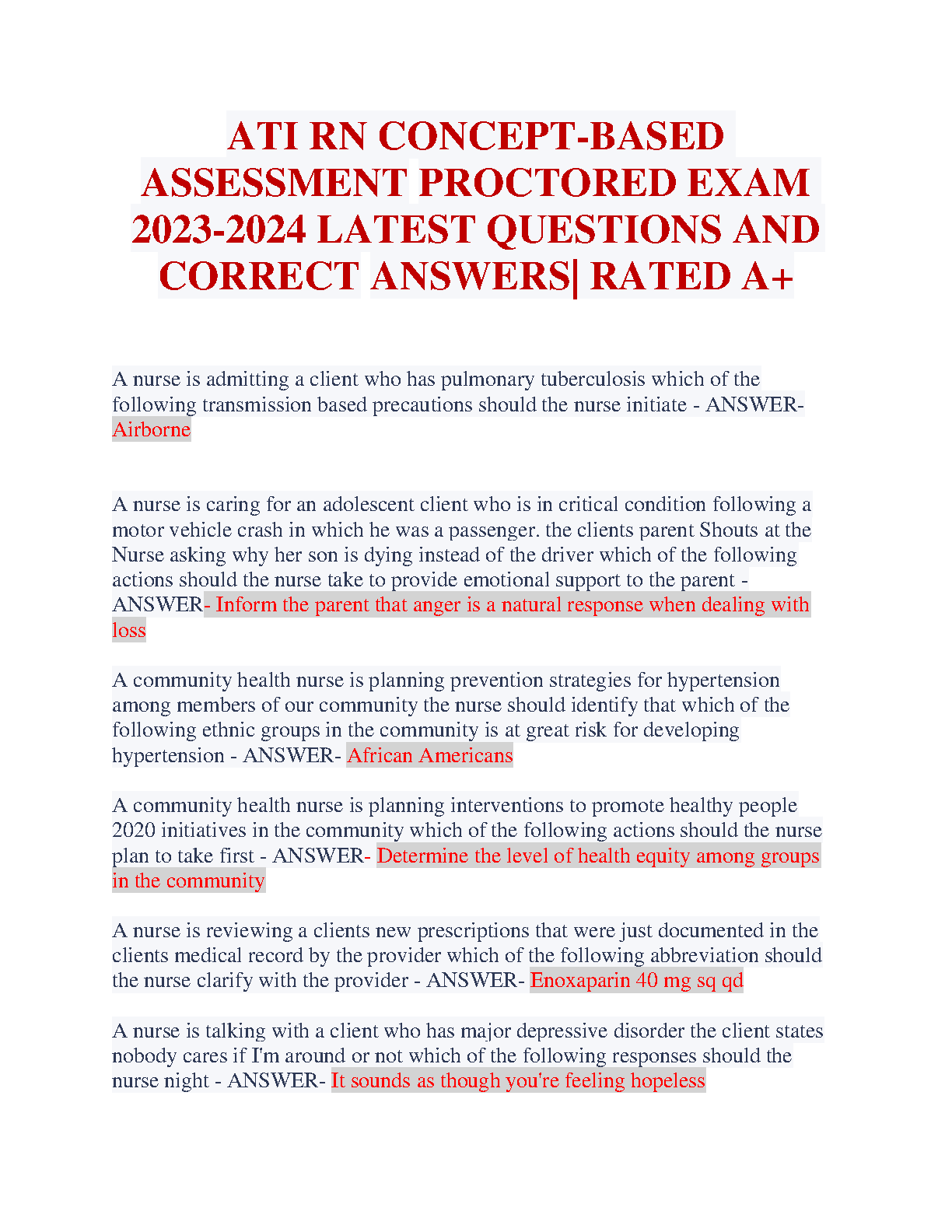 Prepare to excel on your ATI RN Concept-Based Assessment Proctored Exam with our newly updated 2025/2026 Test Bank. This essential resource is meticulously crafted to help you pass on your first attempt, eliminating the stress of resits. Inside, you'll find an extensive collection of the latest exam questions, complete with 100% accurate answers and expert-verified rationales. This guide covers all critical nursing topics, from patient safety and pharmacology to therapeutic communication and community health. Gain the confidence and knowledge you need to master the exam concepts and achieve an A+ grade. Download now and take the most effective step toward your nursing career success.