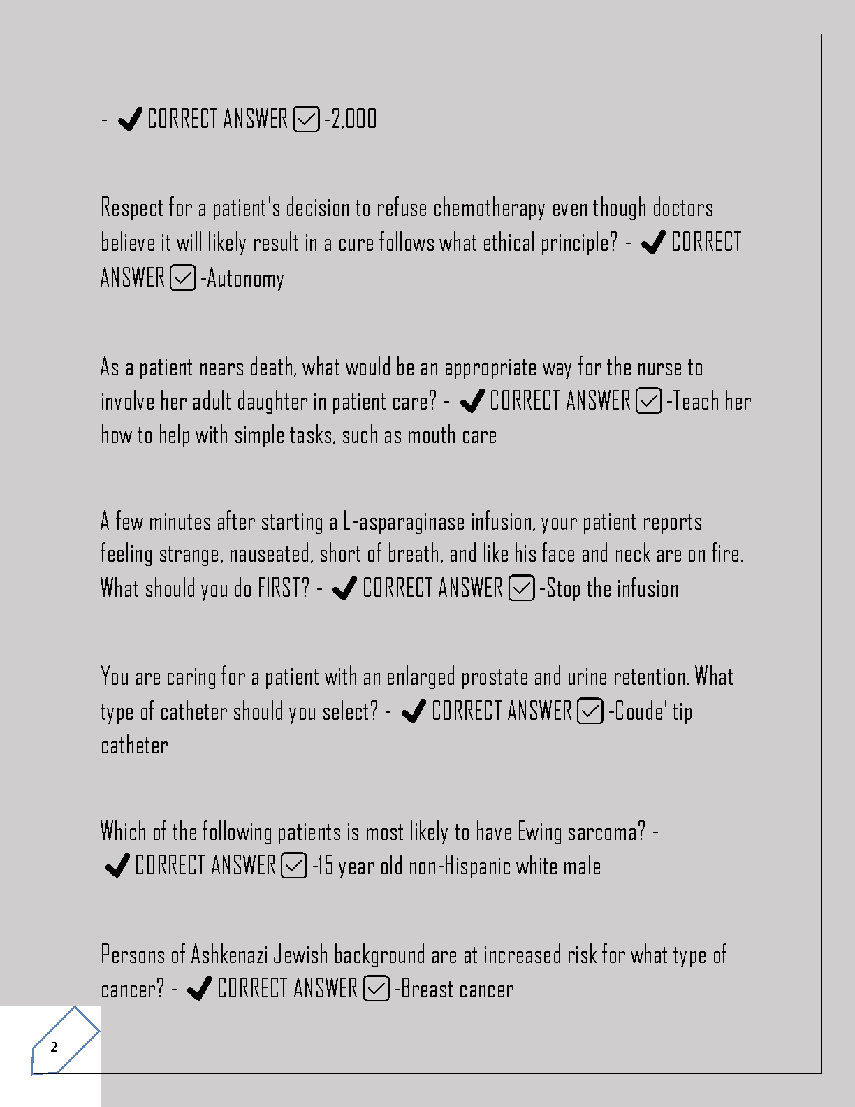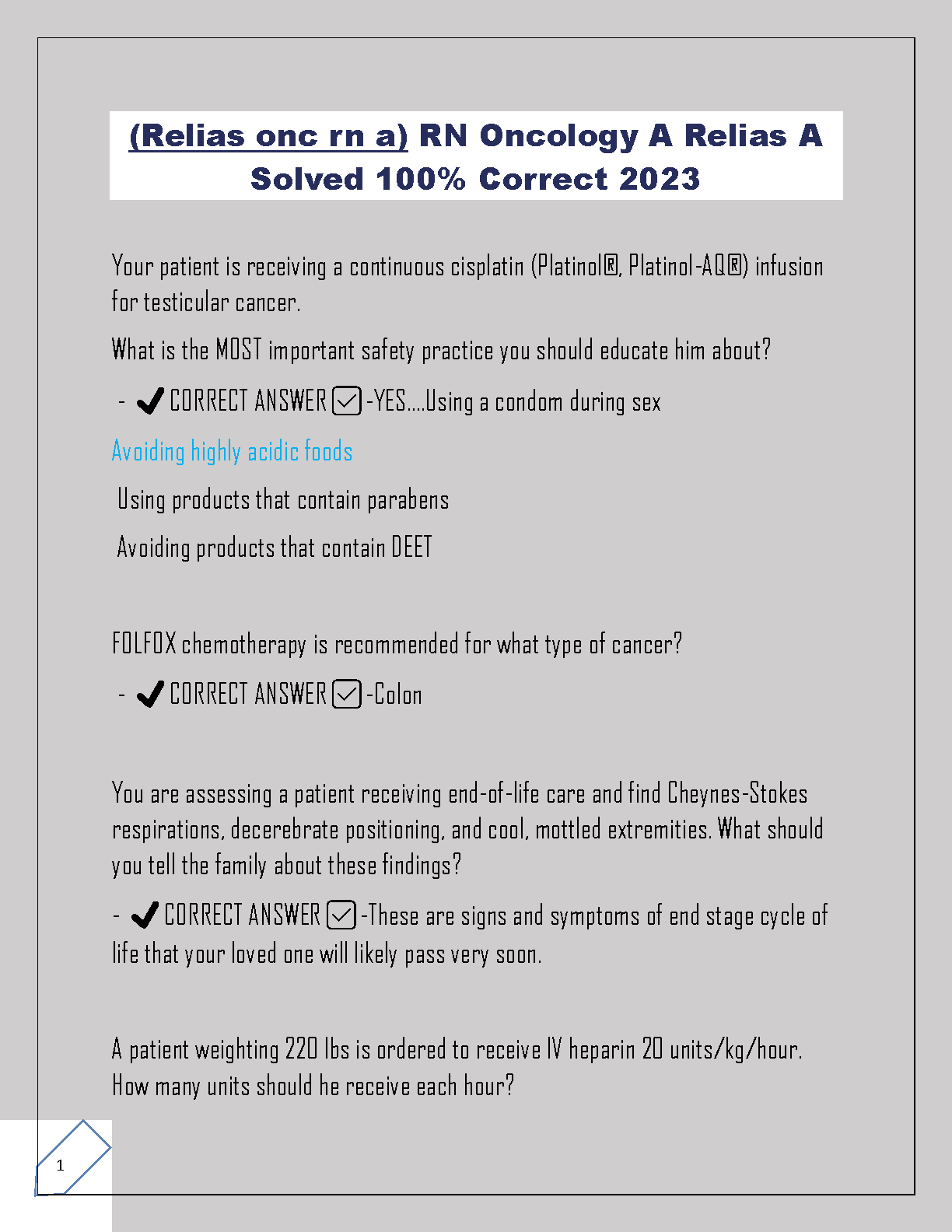 Ace your Relias RN Oncology A certification with our comprehensive test bank, featuring the latest 2023 exam questions and 100% verified answers. This essential study guide covers critical topics including chemotherapy protocols like Cisplatin and FOLFOX, crucial patient safety practices, end-of-life care scenarios, and vital dosage calculations. Each question is paired with a correct, solved answer to deepen your understanding and boost your confidence. Prepare efficiently and pass your oncology nursing exam on the first try with this indispensable resource.