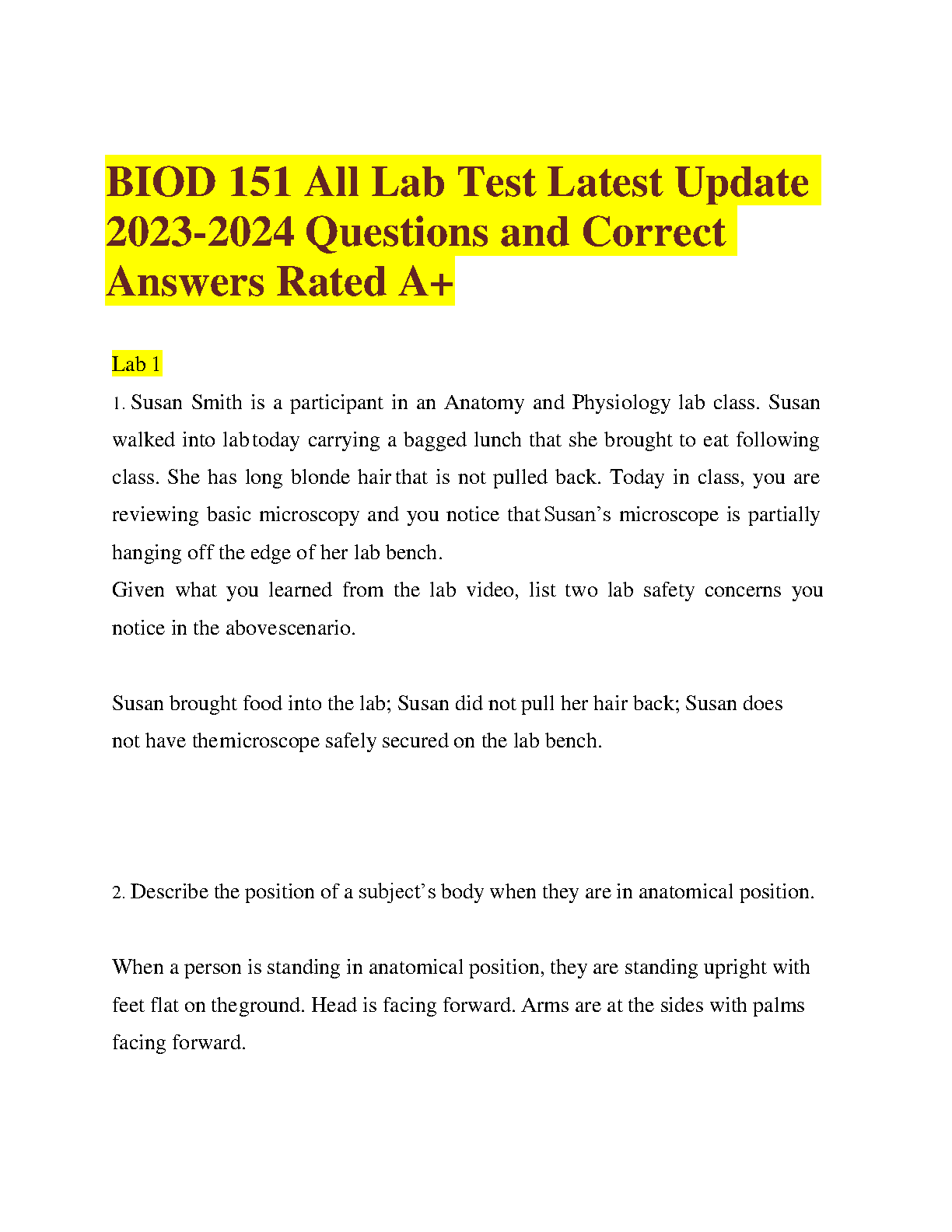 Master your BIOD 151 Anatomy & Physiology labs with our comprehensive and up-to-date test bank for the 2023-2024 academic year. This A+ graded resource contains a full collection of lab questions paired with detailed, correct answers. Covering crucial topics from lab safety procedures to anatomical positions, this study guide is expertly designed to help you prepare for and ace your exams. Get the confidence you need to succeed in your lab assessments with this essential learning tool.