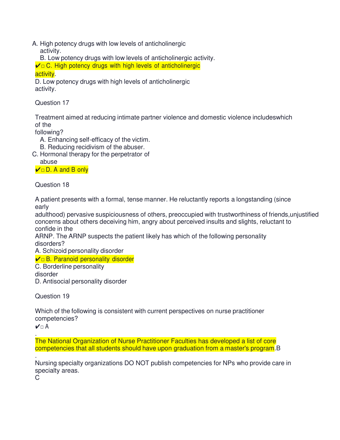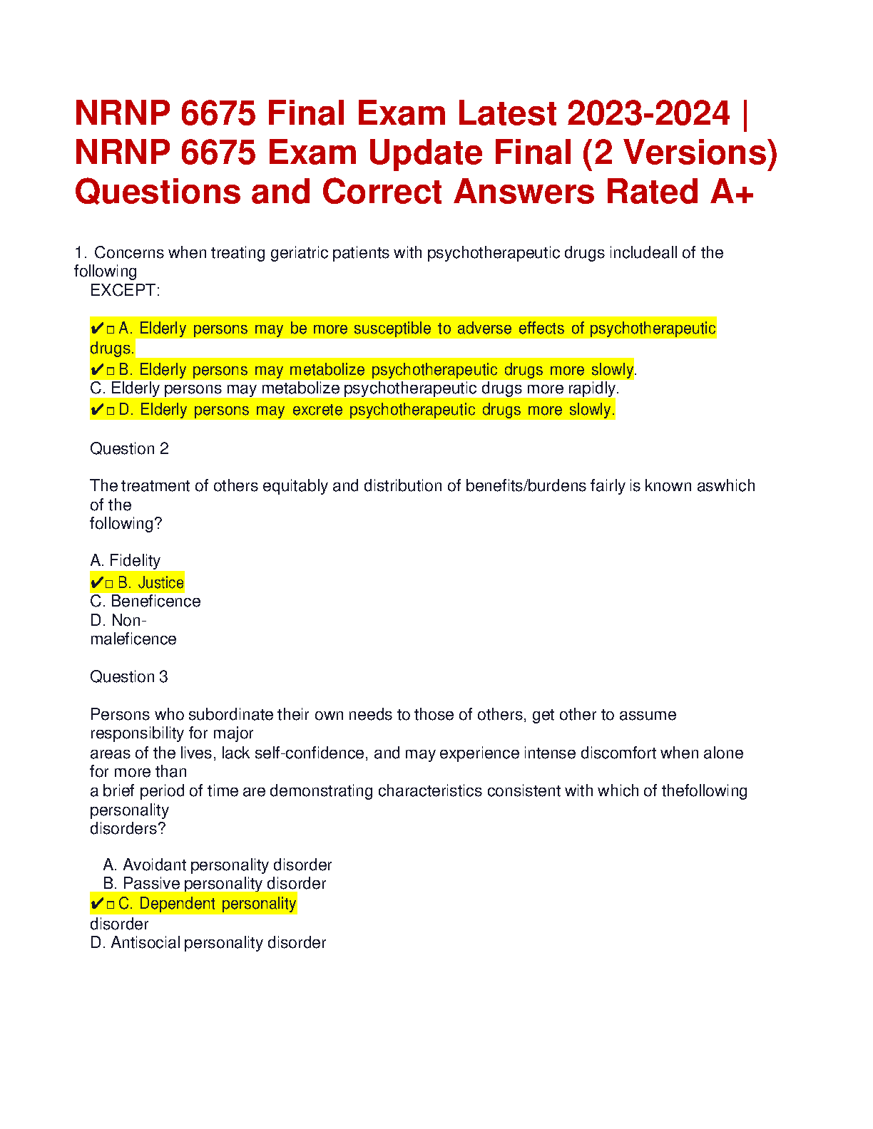 Get ready to ace your NRNP 6675 Final Exam with our comprehensive and up-to-date test bank for the 2025/2026 academic year. This essential study resource includes two complete versions of the final exam, packed with questions and verified answers that have been rated A+. Covering key topics such as psychotherapeutic drug management in geriatric patients, ethical principles like justice, and diagnosis of personality disorders, this guide is designed to give you a thorough understanding of the course material. Stop worrying about resits and secure your success. Download now to study effectively and pass your NRNP 6675 exam on the first attempt!