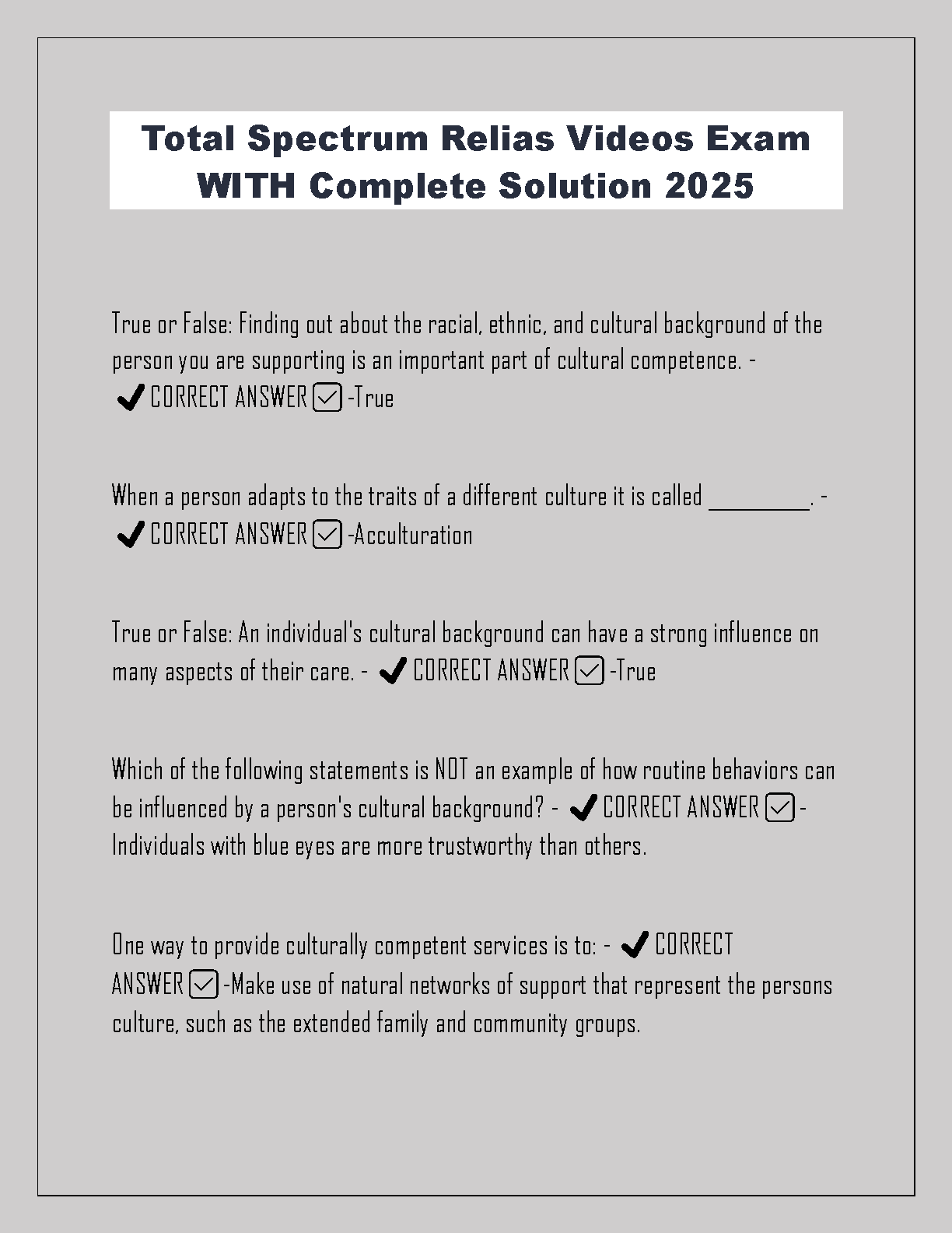 Ace your Total Spectrum Relias Videos Exam with our comprehensive test bank for the 2025/2026 session. This resource features a complete collection of exam questions, each with a detailed and verified correct answer. Master key concepts like cultural competence, acculturation, and providing culturally sensitive care. Our solution guide is expertly crafted to ensure you understand the material thoroughly, helping you pass your certification on the very first attempt. Download now for immediate access to the study materials you need for success.