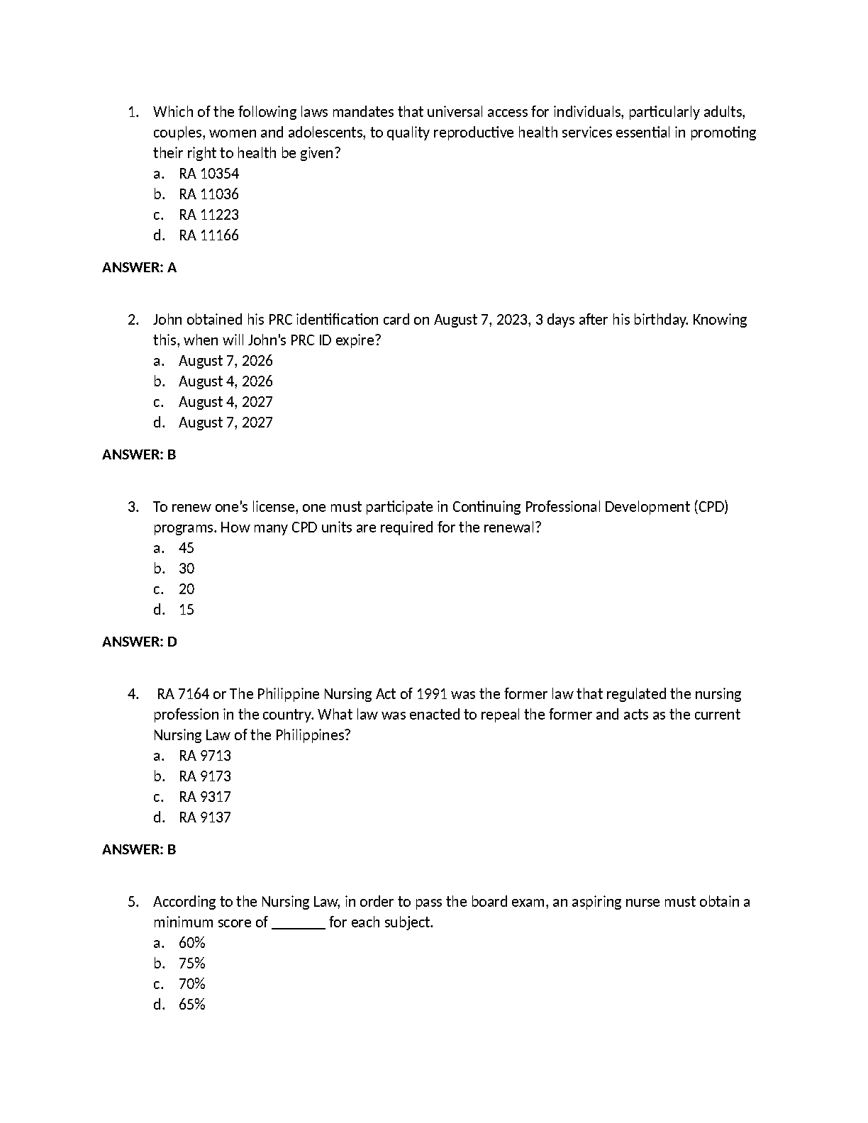 Ace the Philippine Nursing Licensure Examination (PNLE) with our comprehensive Test Bank for 2025/2026! This essential study guide features a curated set of questions and detailed answers focusing on critical topics in Nursing Jurisprudence, Ethics, and Professional Adjustment. Master key legislation like the Philippine Nursing Act (RA 9173), understand PRC rules on license renewal and CPD units, and grasp the specifics of board exam requirements. Designed to mirror the actual exam format, this resource is your key to building confidence and passing the PNLE on your first try. Avoid resits and start your nursing career successfully with these verified practice questions.
