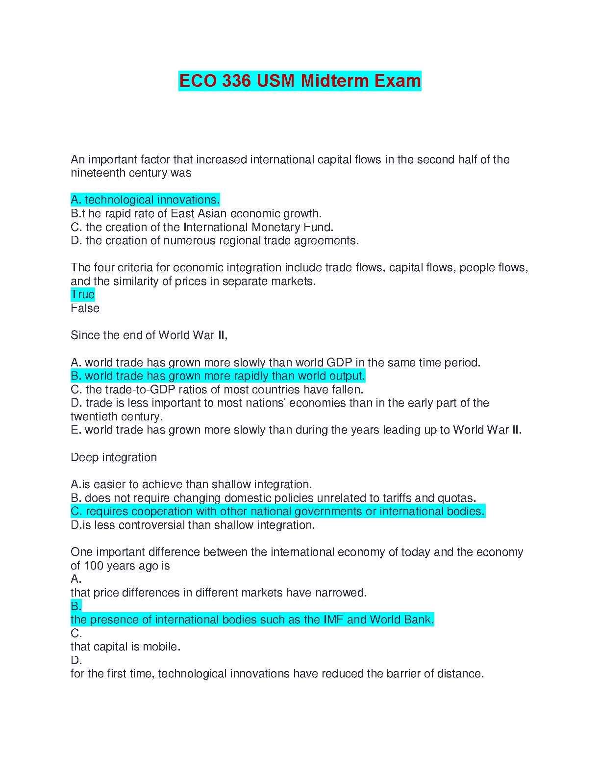 Instantly download the latest 2025/2026 Test Bank for the ECO 336 USM Midterm Exam. This expertly curated study resource is your key to mastering International Economics and securing a top grade. Inside, you'll find a complete collection of exam-style questions with 100% correct, verified answers. This guide thoroughly covers crucial topics such as international capital flows, economic integration, post-WWII world trade trends, deep integration policies, and the function of global financial institutions. Designed to help you pass on your first try, this test bank is the most effective way to prepare for your midterm and excel in your studies.