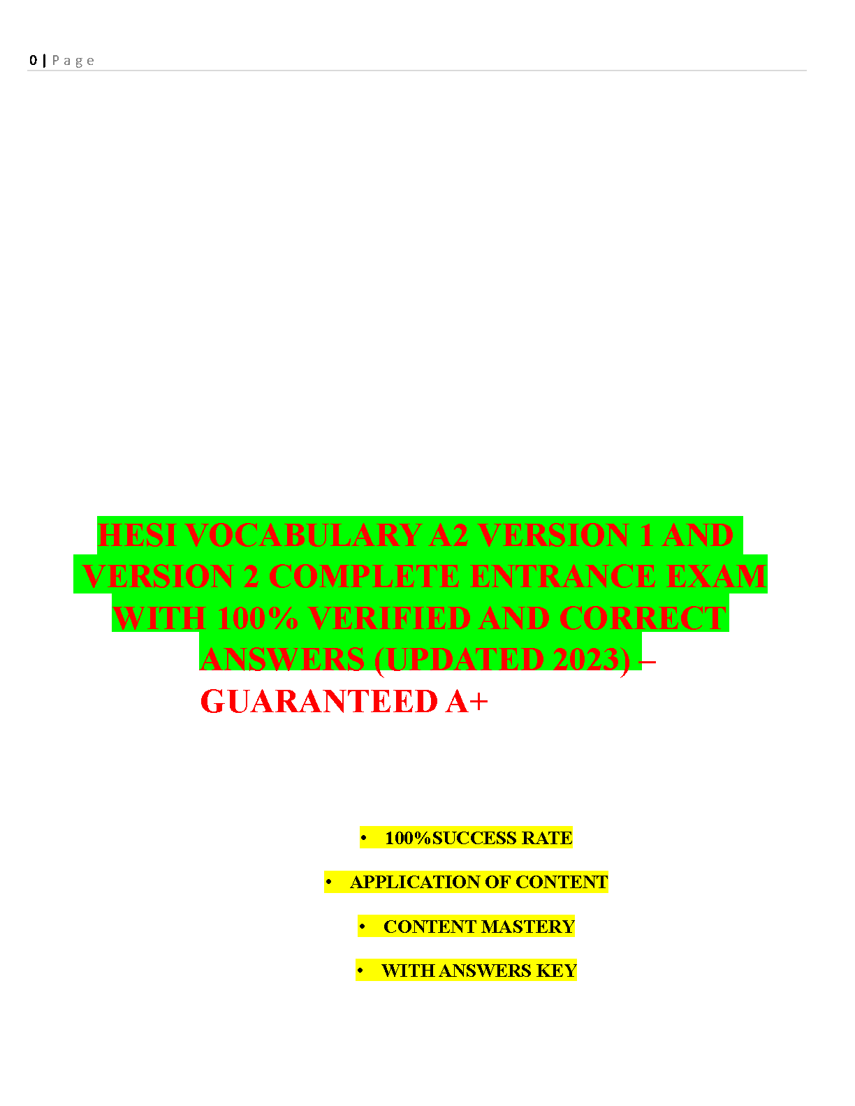 Master the HESI A2 Vocabulary section and ace your entrance exam on the first try! This comprehensive study package includes both Version 1 and Version 2 of the exam, featuring a complete set of questions with 100% verified and correct answers. Updated for the 2024 testing cycle, our guide is meticulously designed to ensure content mastery and application of knowledge. Say goodbye to exam anxiety and avoid costly resits. With our guaranteed A+ material, you'll have the confidence and the knowledge to achieve an outstanding score and unlock your path to nursing school success.