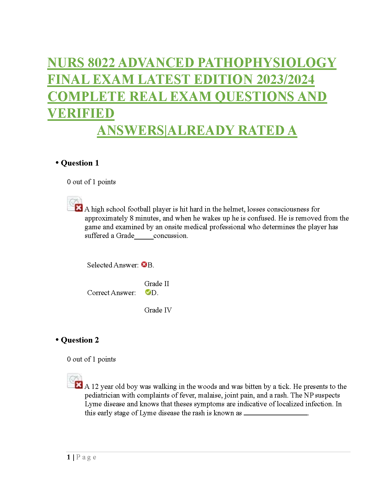 Master your NURS 8022 Advanced Pathophysiology final exam with our comprehensive Test Bank, updated for the 2023/2024 academic year. This essential study tool provides a complete set of authentic exam questions, each accompanied by a verified, correct answer. Aligned with the foundational text by McCance & Huether, this resource is meticulously designed to deepen your understanding of complex disease processes and prepare you for exam day. Ace your final and solidify your pathophysiology knowledge with this top-rated, A-grade guide.