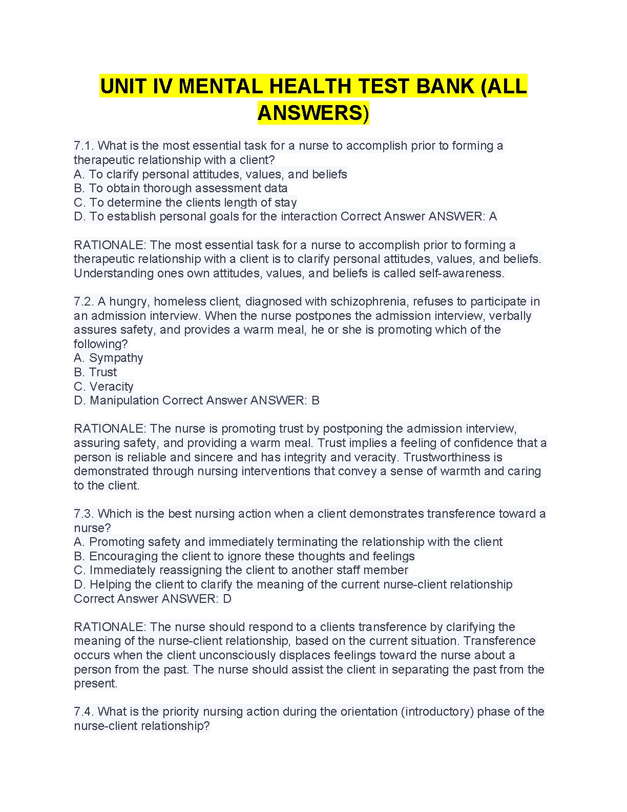TEST BANK FOR UNIT IV MENTAL HEALTH. QUESTIONS AND ANSWERS. RATED A+