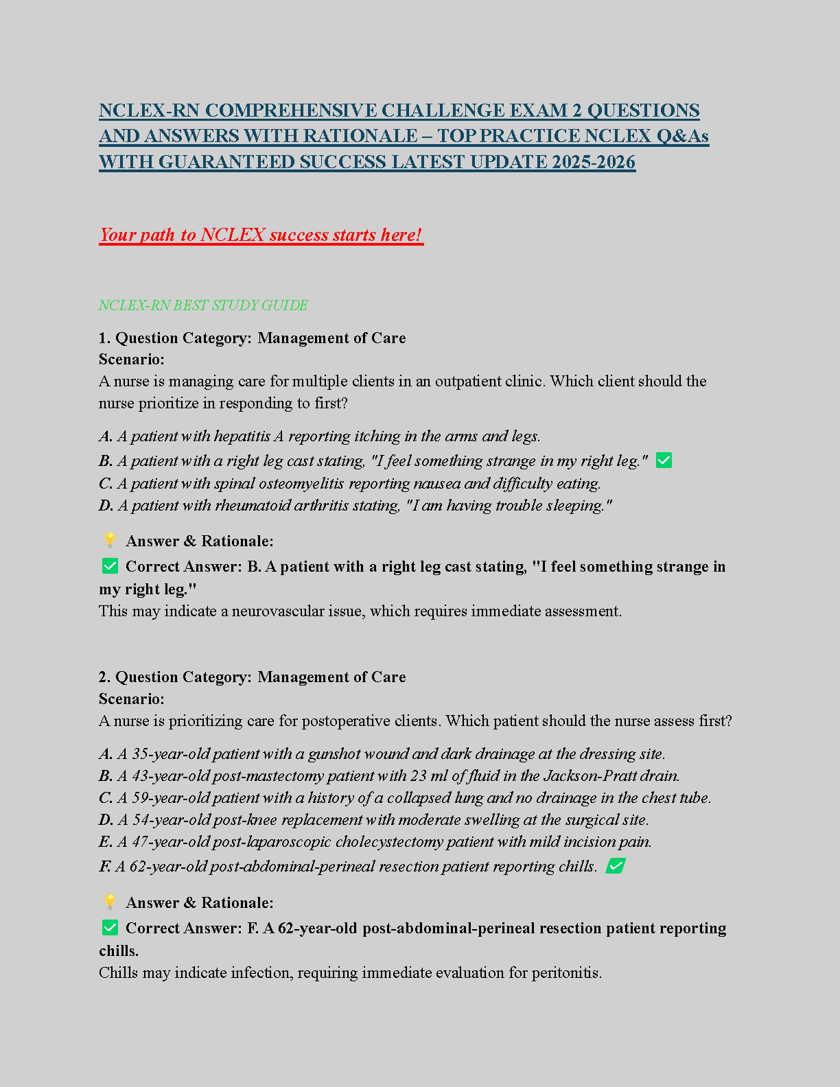 Unlock your potential and pass the NCLEX-RN on your first attempt with our latest 2025-2026 Comprehensive Challenge Exam 2 Test Bank. This essential study guide provides a complete set of practice questions, verified answers, and detailed rationales that explain the 'why' behind each correct choice. Covering critical nursing concepts like Management of Care, this resource is meticulously designed to mirror the actual exam format, helping you build confidence and master the material. Stop worrying about resits—start your journey to becoming a registered nurse today with this guaranteed path to success.