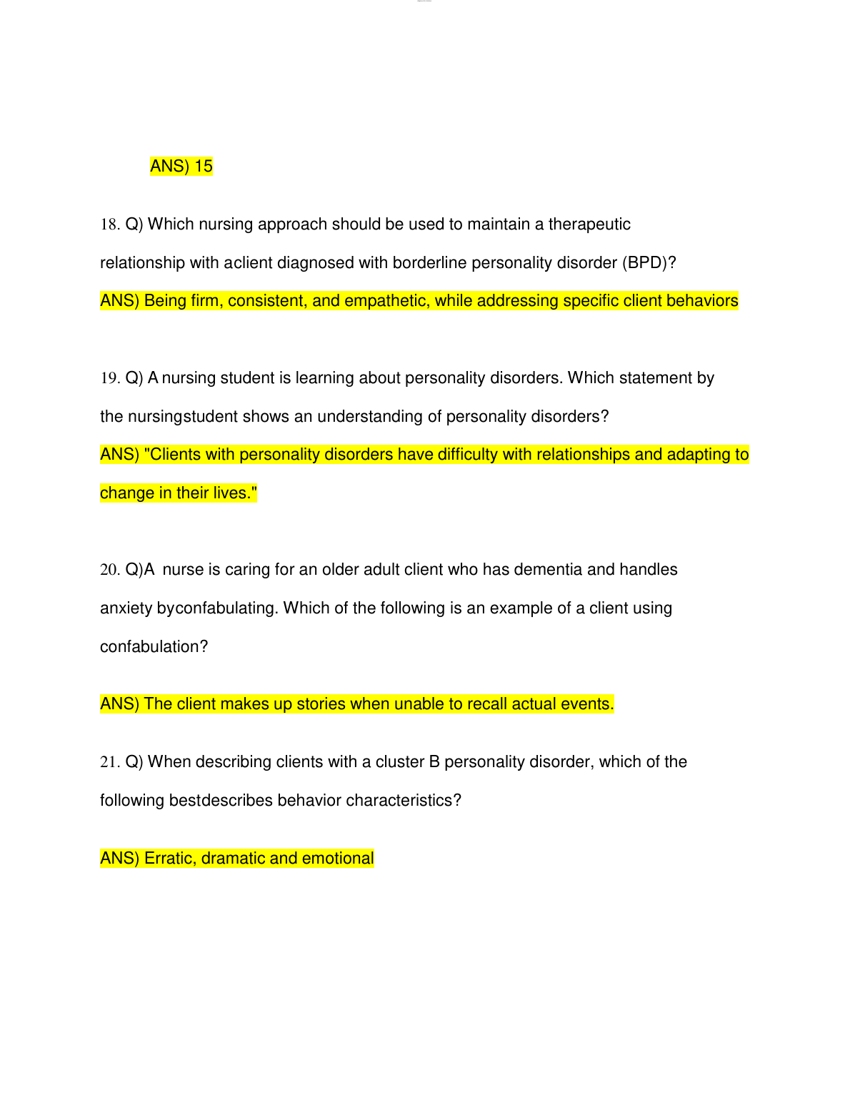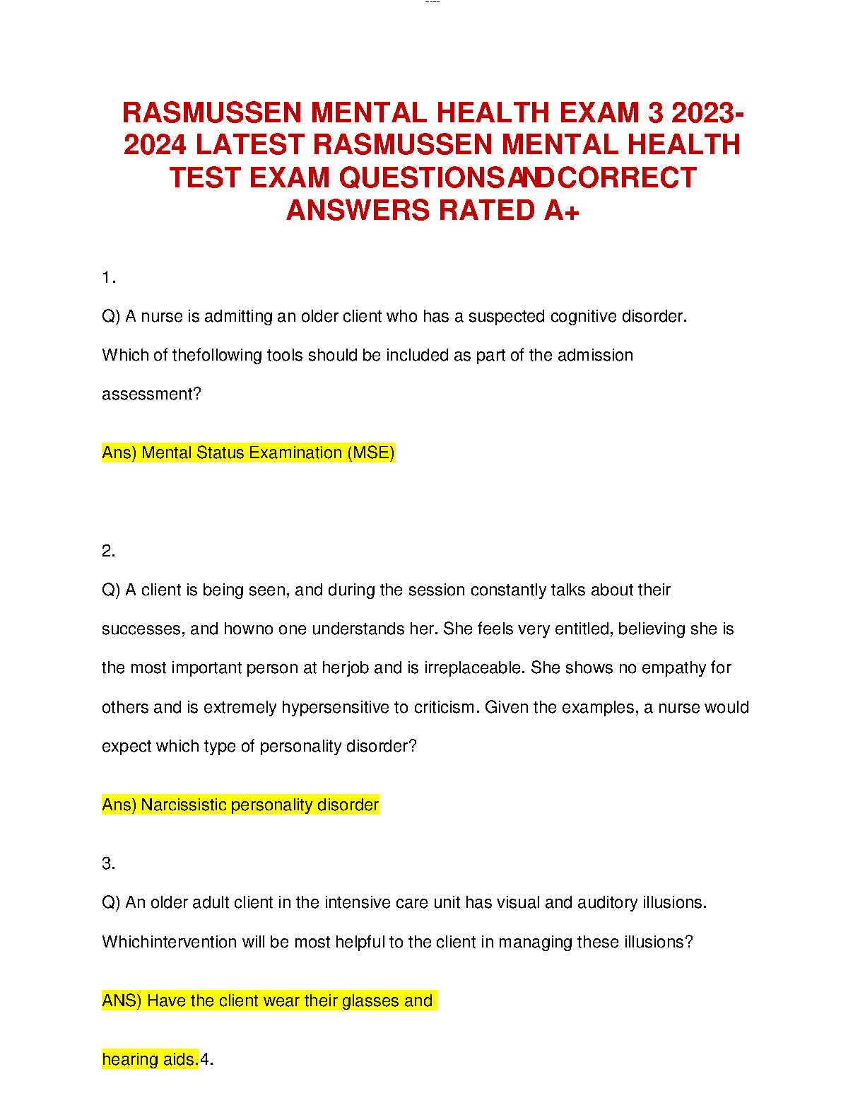 Ace your Rasmussen Mental Health Exam 3 with this comprehensive 2023-2024 test bank. This A+ graded resource contains the latest exam questions paired with detailed, correct answers. Covering essential topics such as cognitive assessments, personality disorders, and nursing interventions, this study guide is your key to mastering the course material. Download now to prepare effectively and boost your confidence for exam day.