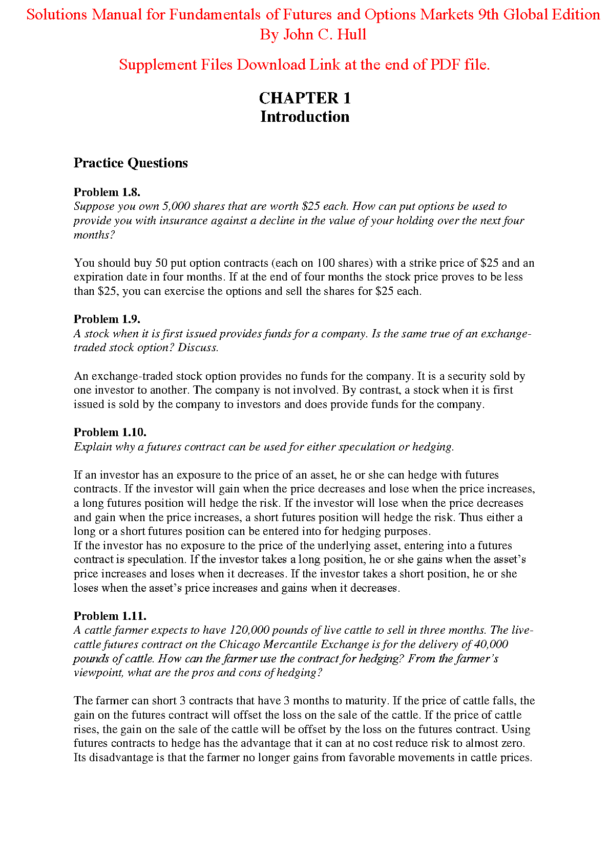 Gain a complete understanding of financial derivatives with the official Solutions Manual for 'Fundamentals of Futures and Options Markets, 9th Global Edition' by John C. Hull. This comprehensive resource provides detailed, step-by-step answers to all end-of-chapter problems and practice questions from the textbook. Ideal for exam preparation, this solutions manual helps you master complex concepts in options, futures, and other derivatives, ensuring you have the confidence and knowledge to excel in your finance courses. Instantly download this essential study aid to verify your work and ace your exams.