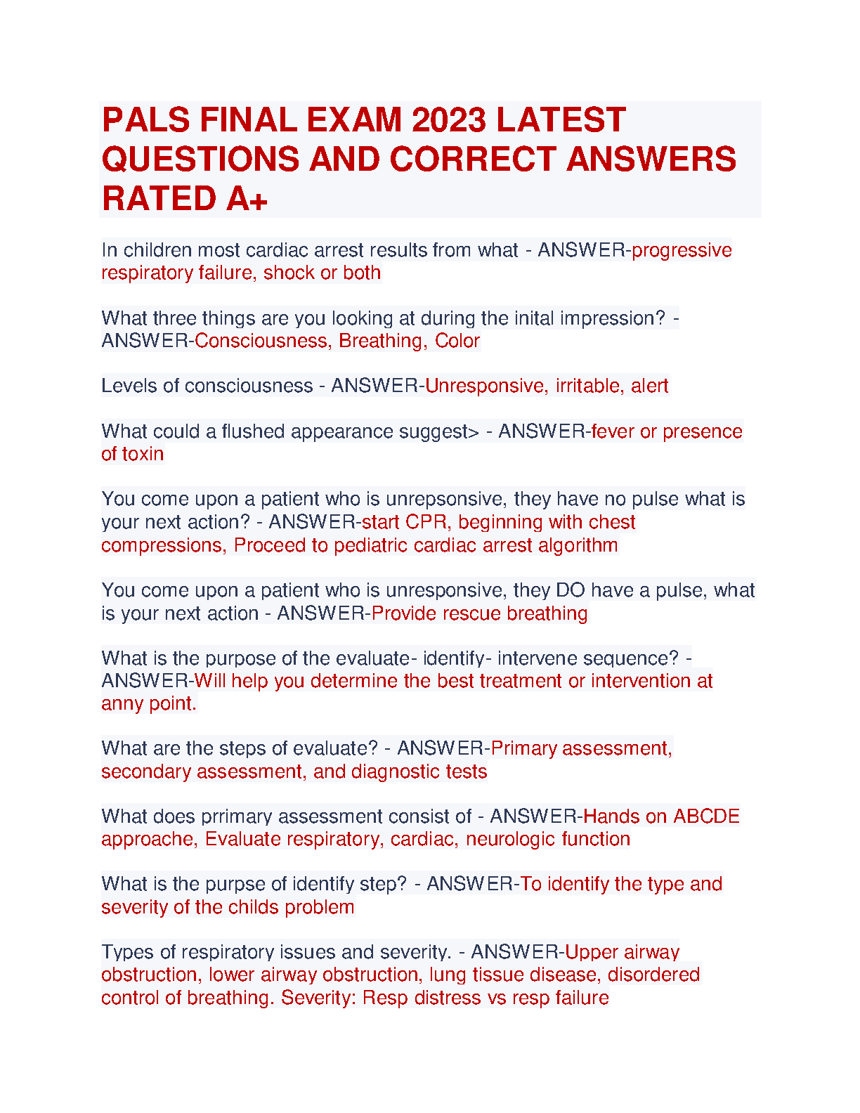 Ace your Pediatric Advanced Life Support (PALS) certification with our comprehensive Final Exam Test Bank for 2024/2025. This A+ graded resource features the latest, verified questions and detailed correct answers, meticulously aligned with the current American Heart Association (AHA) guidelines. Master crucial topics such as pediatric assessment, respiratory failure, shock management, CPR protocols, and cardiac arrest algorithms. This study guide is expertly designed to help you understand key concepts and pass your PALS final exam confidently on your first try. Avoid resits and secure your certification with this essential preparation tool.