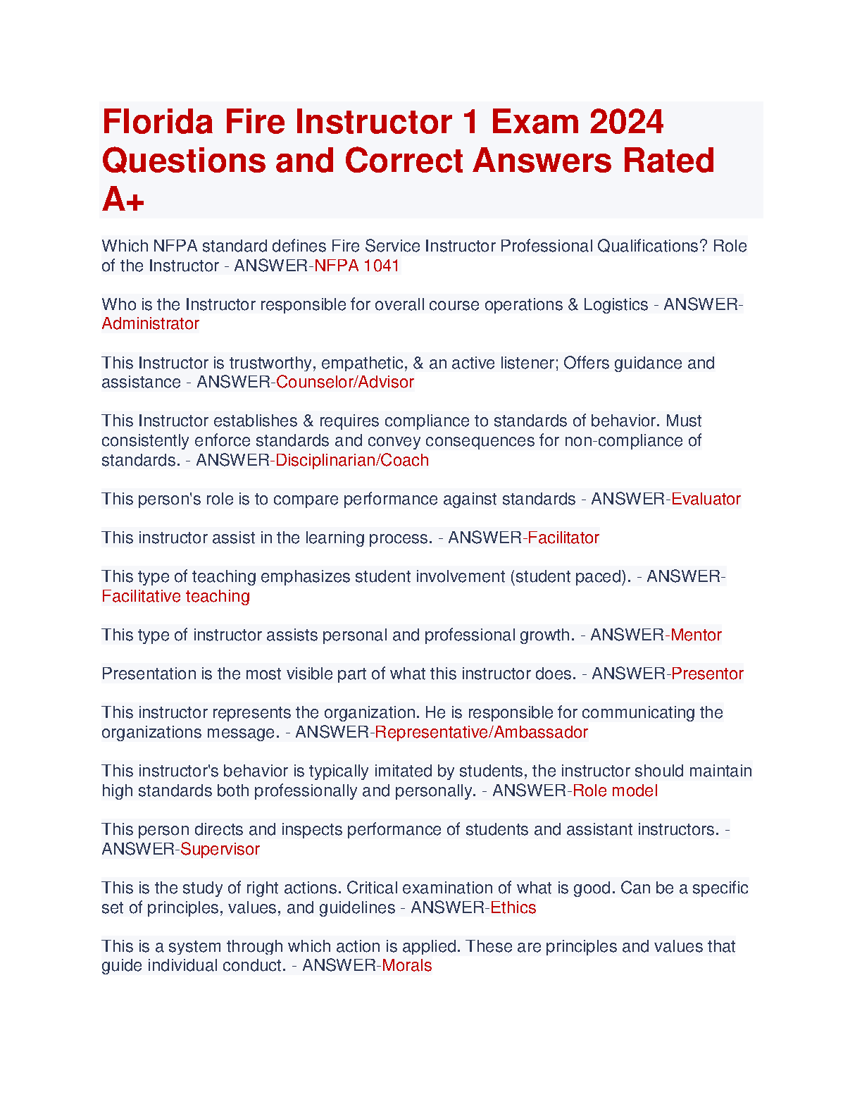 Unlock success in your Florida Fire Instructor 1 certification exam with our comprehensive 2025/2026 test bank. This premium study guide is packed with the latest exam questions and meticulously verified correct answers, all rated A+ for accuracy. Our resource covers all essential topics, including NFPA 1041 standards, instructor roles, teaching methodologies, and professional ethics. Designed to help you study efficiently and master the material, this test bank is your ultimate tool to pass the exam on your first attempt and avoid costly resits. Get ready to ace your certification with confidence!