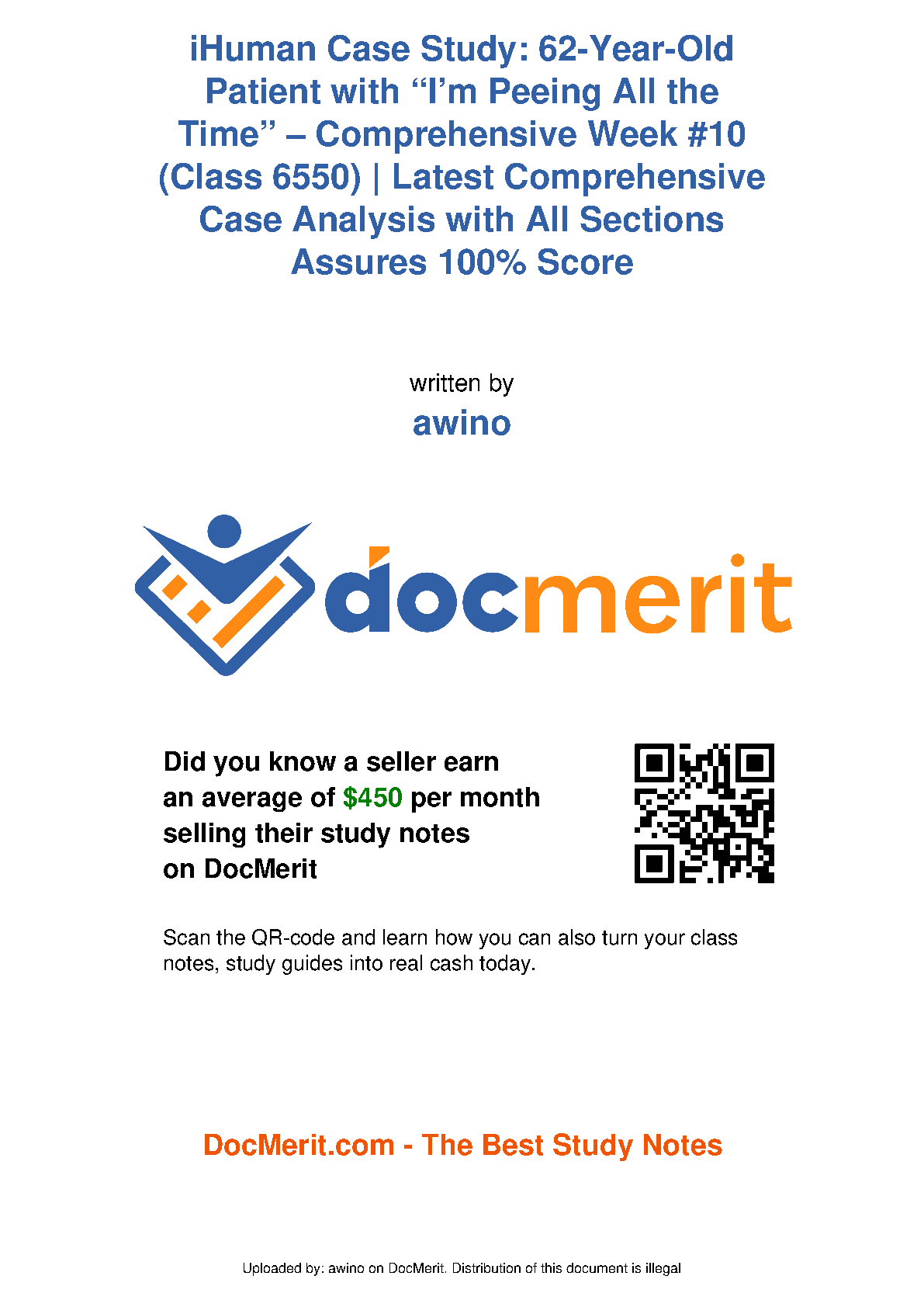 Struggling with the iHuman case study for Class 6550, Week 10? This comprehensive guide provides a detailed analysis of the 62-year-old patient presenting with 'I'm peeing all the time.' Our latest 2025/2026 edition covers every section of the case study, offering expert insights and correct answers to help you achieve a 100% score. Master the material, pass your exam on the first attempt, and avoid costly resits with this essential study resource.